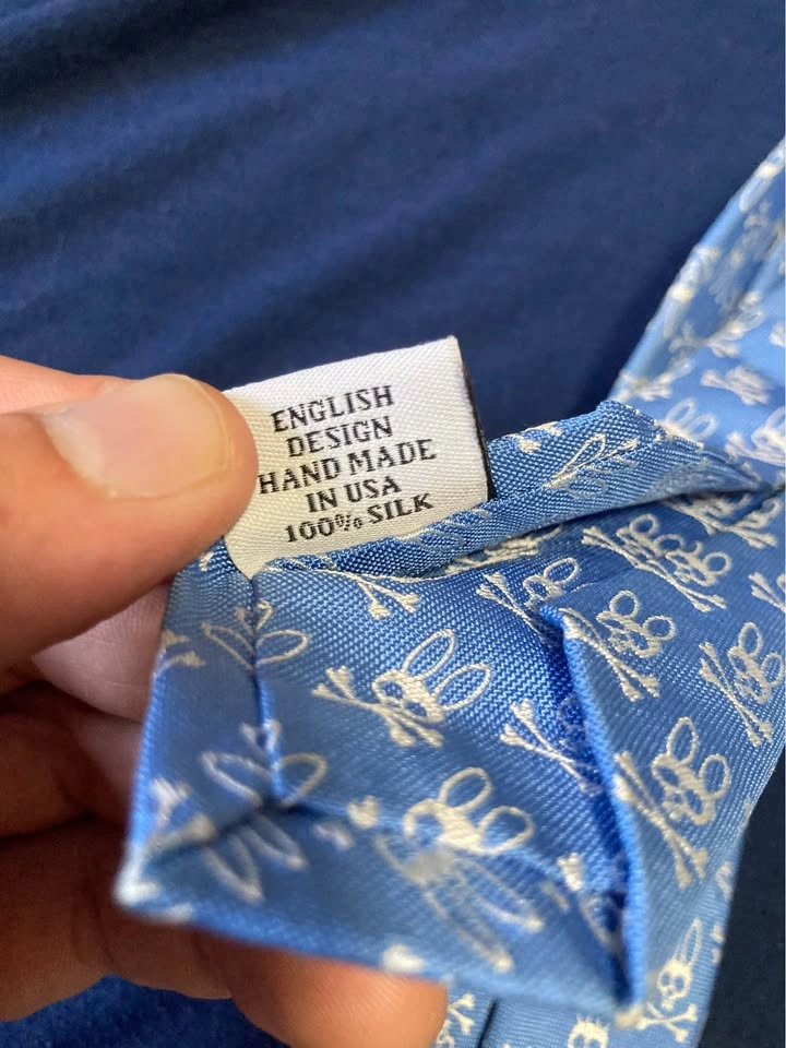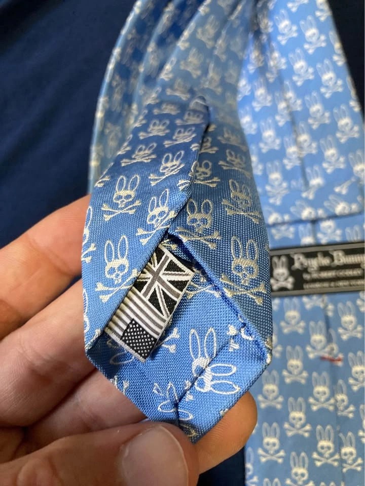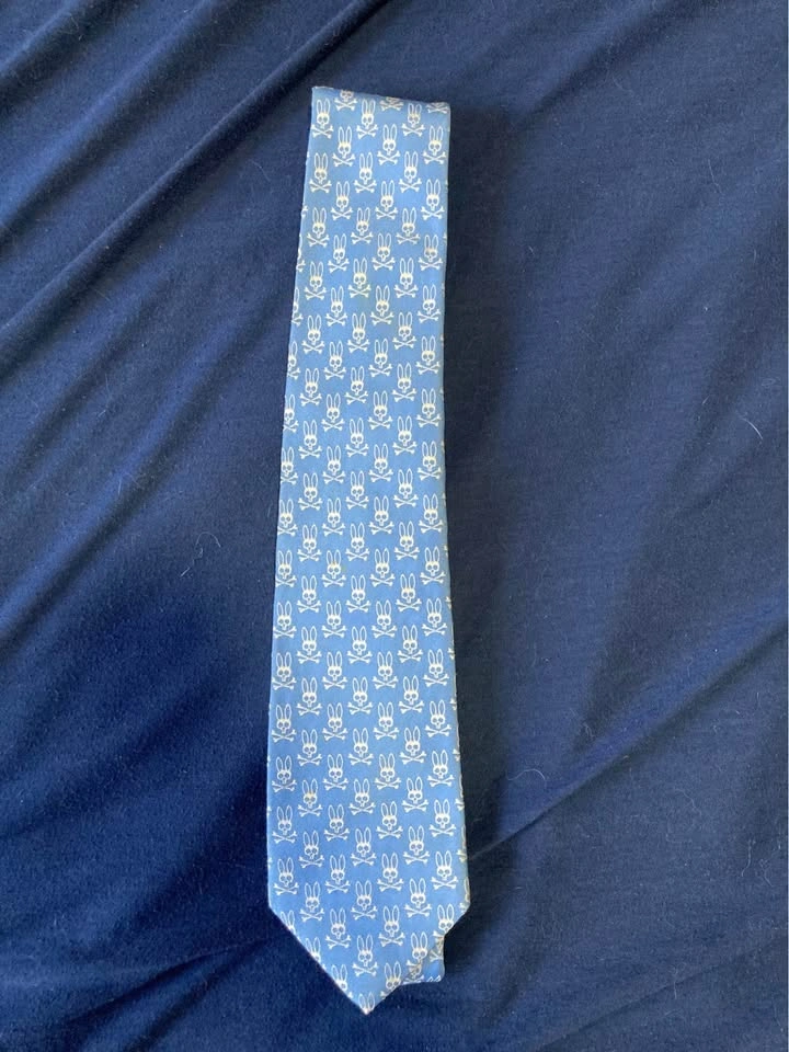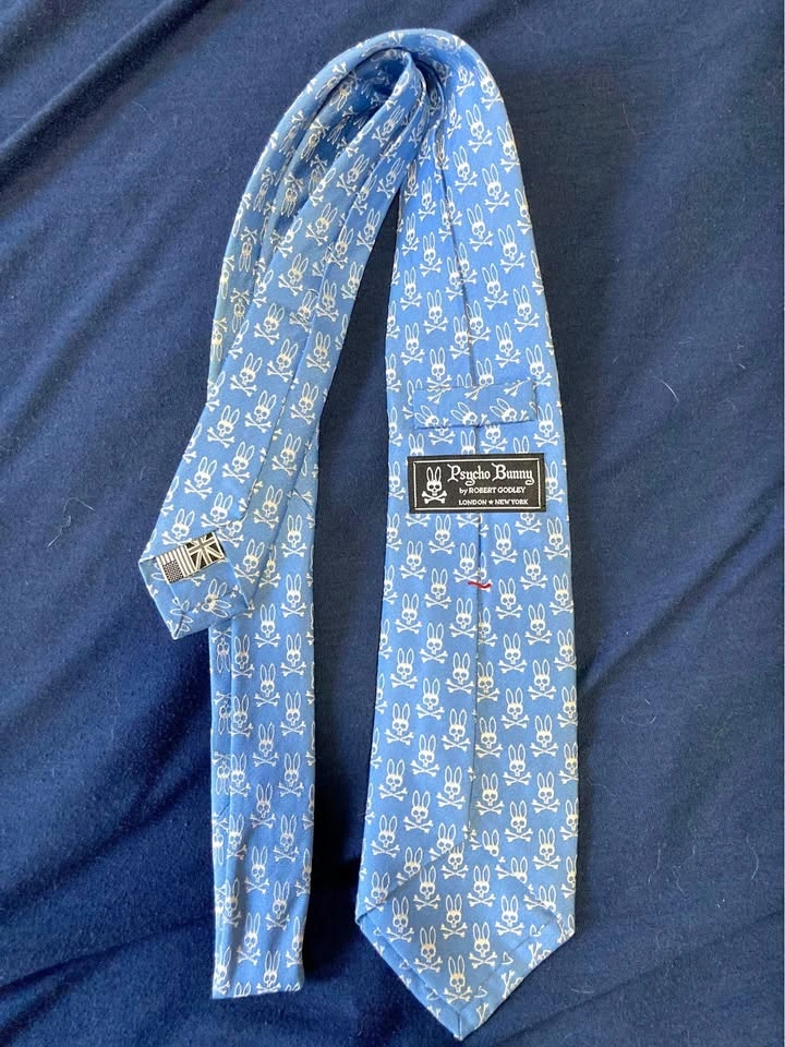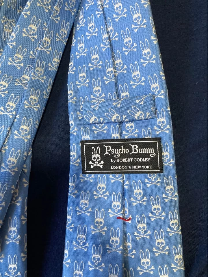 65Handmade in USA, 100% silk, blue psycho bunny necktie with psycho bunny logo all over. Available for pickup in portage park