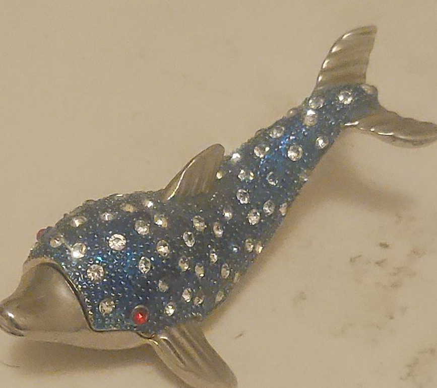 Here's a cute little blue dolphin brooch. It's covered in rhinestones and has silver accents. It would be a great addition to any outfit!