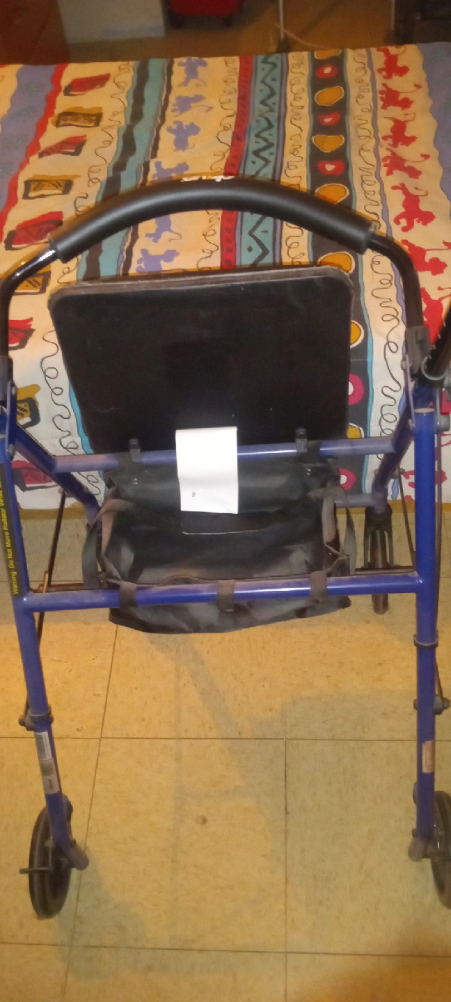 Selling a blue rolling walker with a seat and a storage bag underneath. It appears to be in good condition and ready to help someone get around more easily