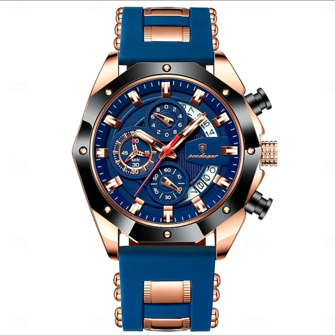 10This eye-catching chronograph watch features a bold blue dial with rose gold accents and a matching strap. Three sub-dials offer multifunctional utility, including a 24-hour indicator, while the date window adds everyday convenience. With quartz movement, it delivers precise timekeeping without relying on hand motion. Lightweight and stylish, it's built for comfort and impact.