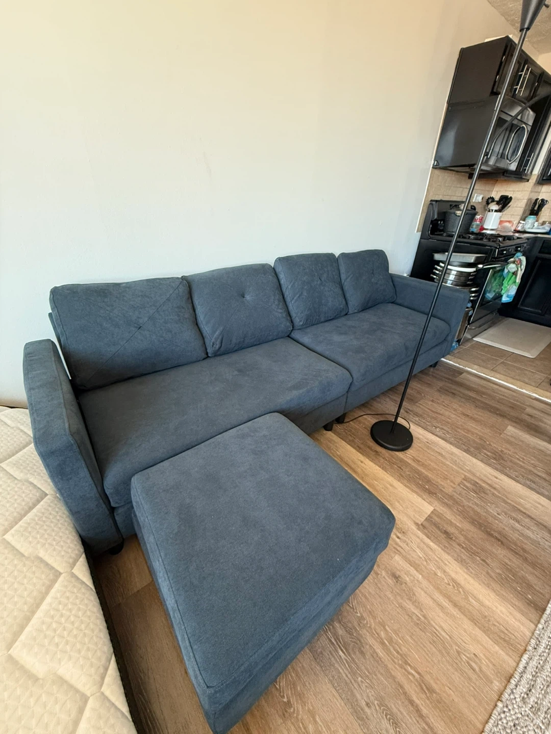 60Here's a comfy blue sectional sofa with a matching ottoman! It's in great condition and ready for a new home. Perfect for lounging and relaxing after a long day. Only pick up! Elevator is available. Selling because moving out
