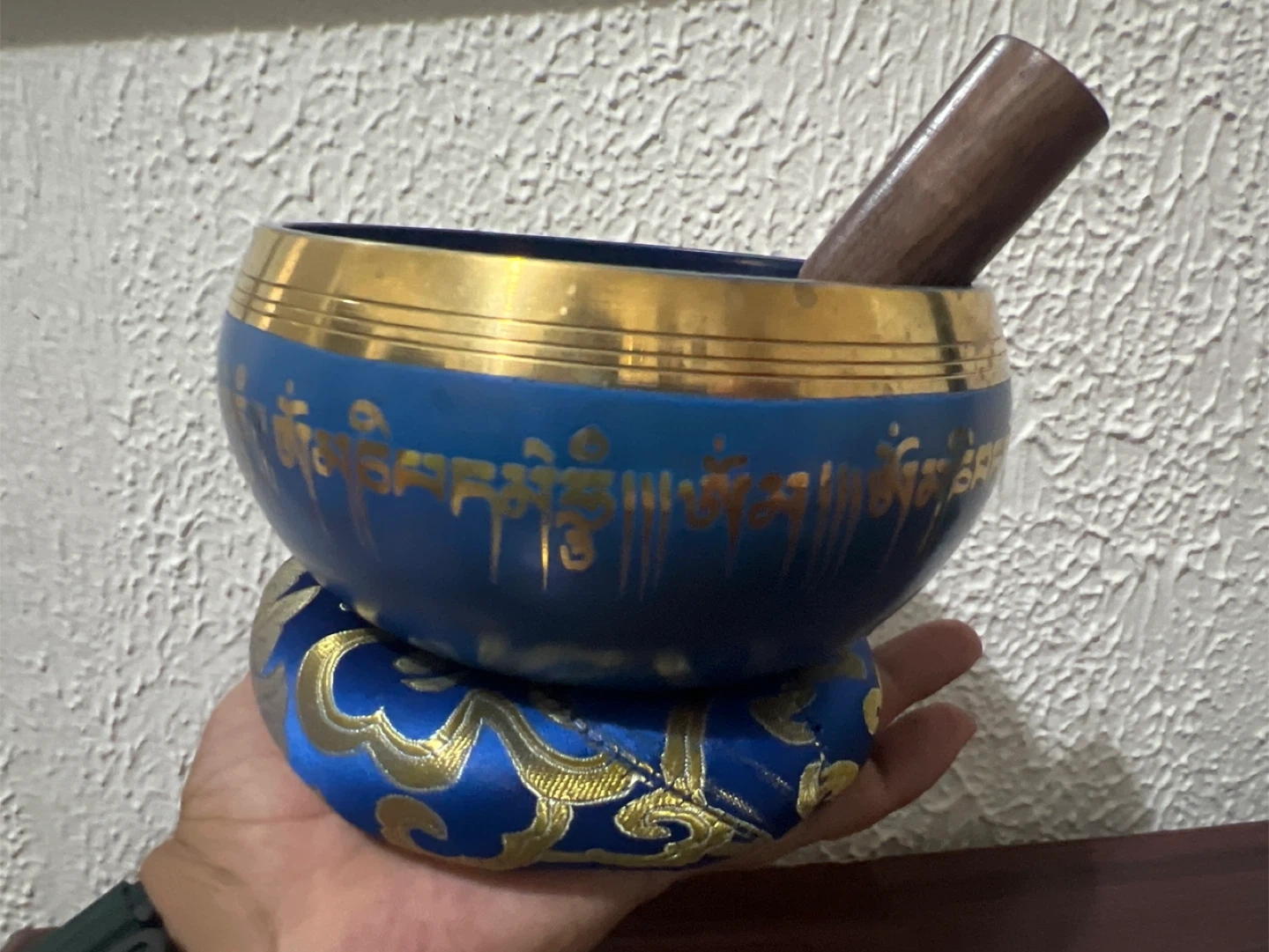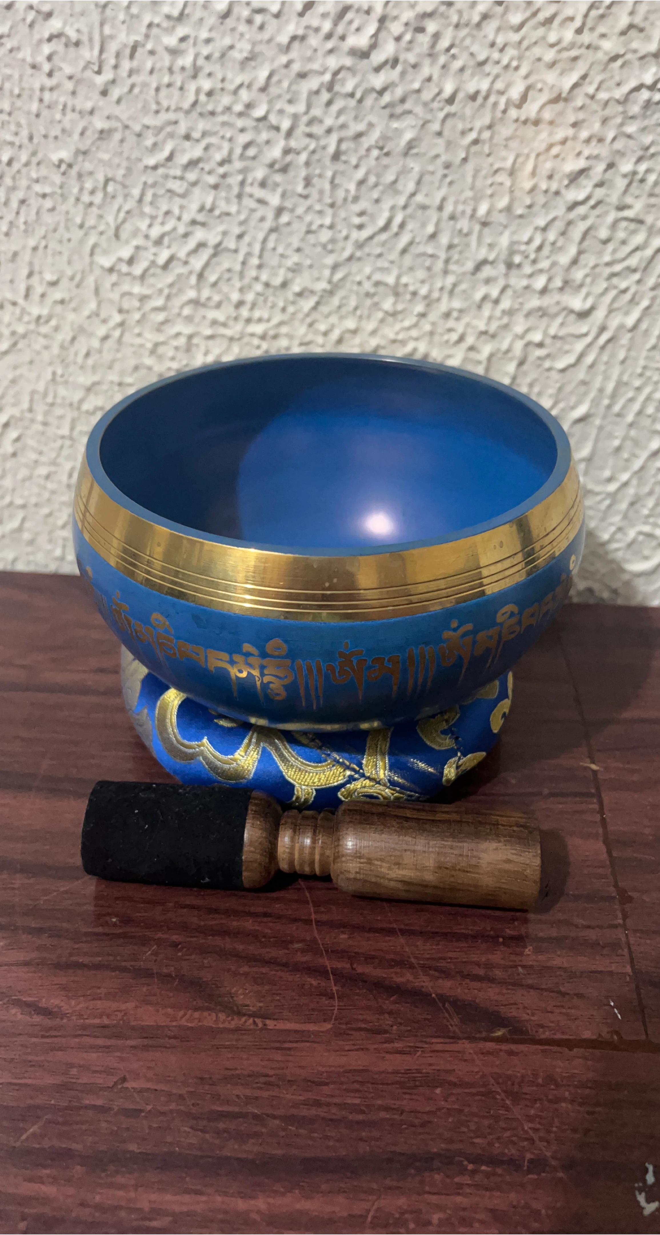I'm selling a beautiful blue singing bowl. It comes with a wooden striker and a cushion. This bowl is perfect for meditation and relaxation. The bowl has a nice ring to it!