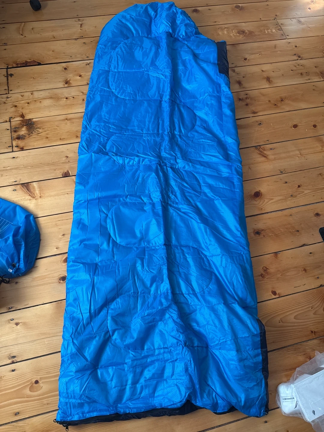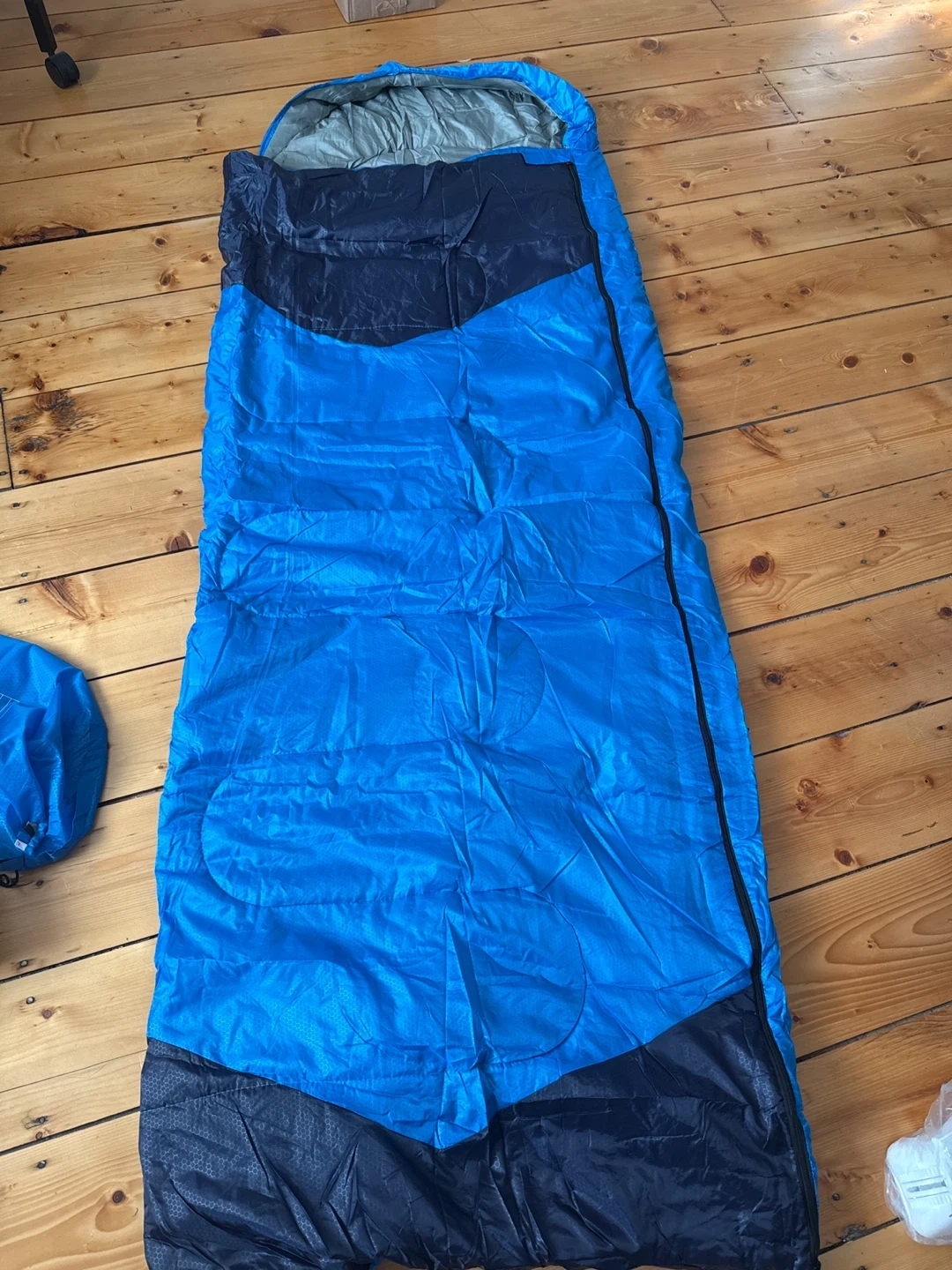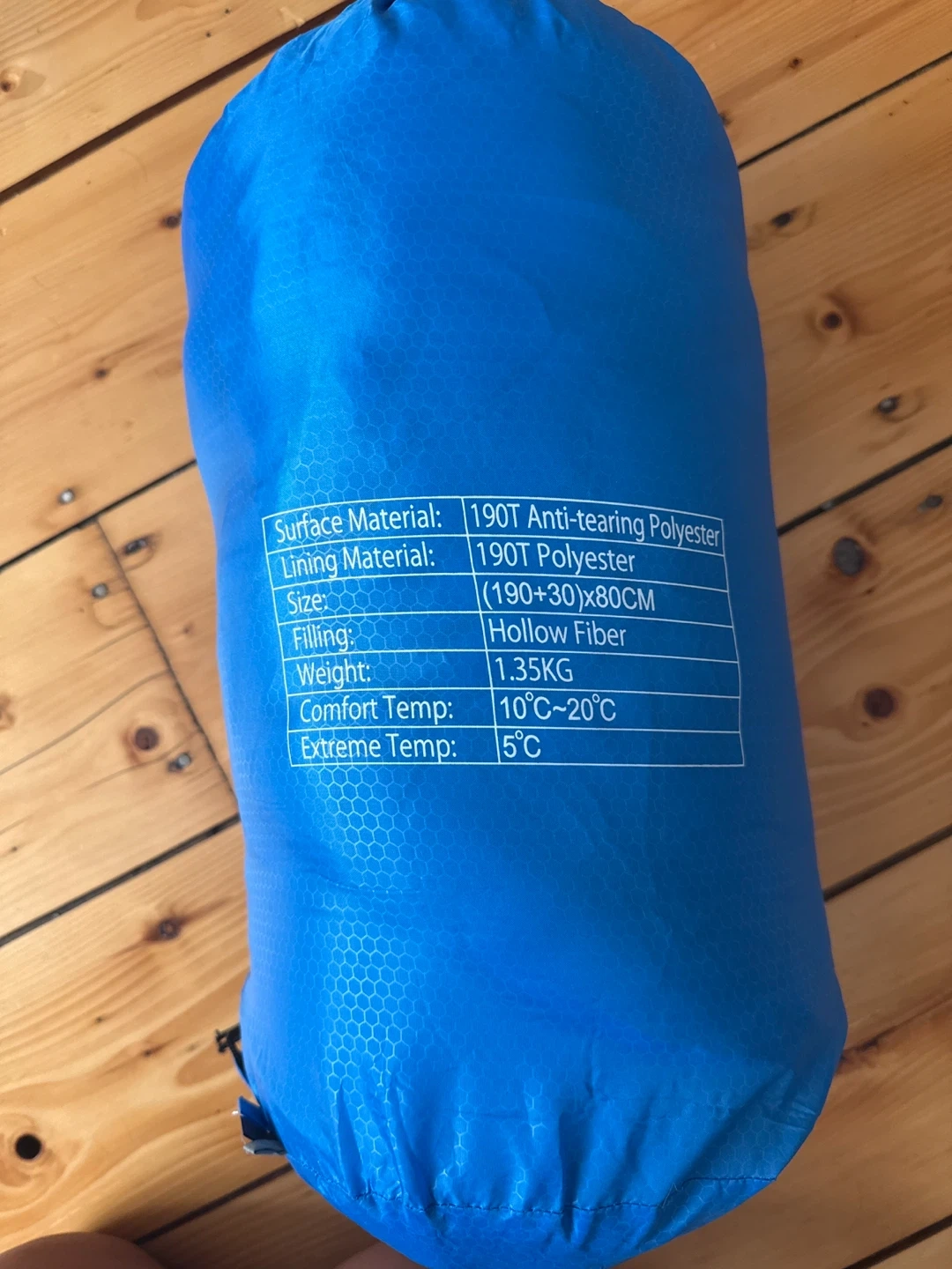 Here's a blue sleeping bag ready for your next adventure! It's made with 190T anti-tearing polyester for the surface and lining. The size is (190+30)x80CM and it's filled with hollow fiber. It weighs about 1.35KG and is most comfortable between 10°C and 20°C. It can handle extreme temperatures down to 5°C