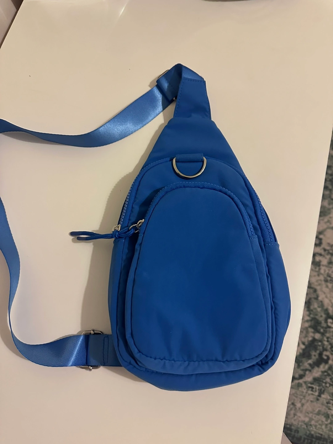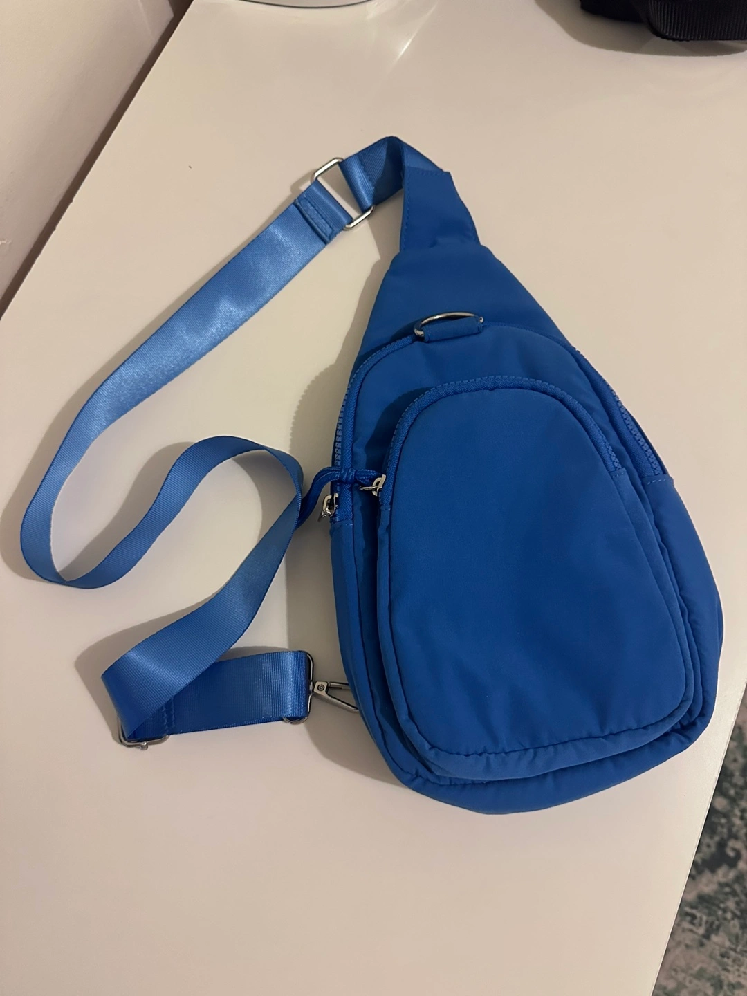 This is a cute blue sling bag! It's in great condition and ready for a new home. Perfect for carrying your essentials on the go