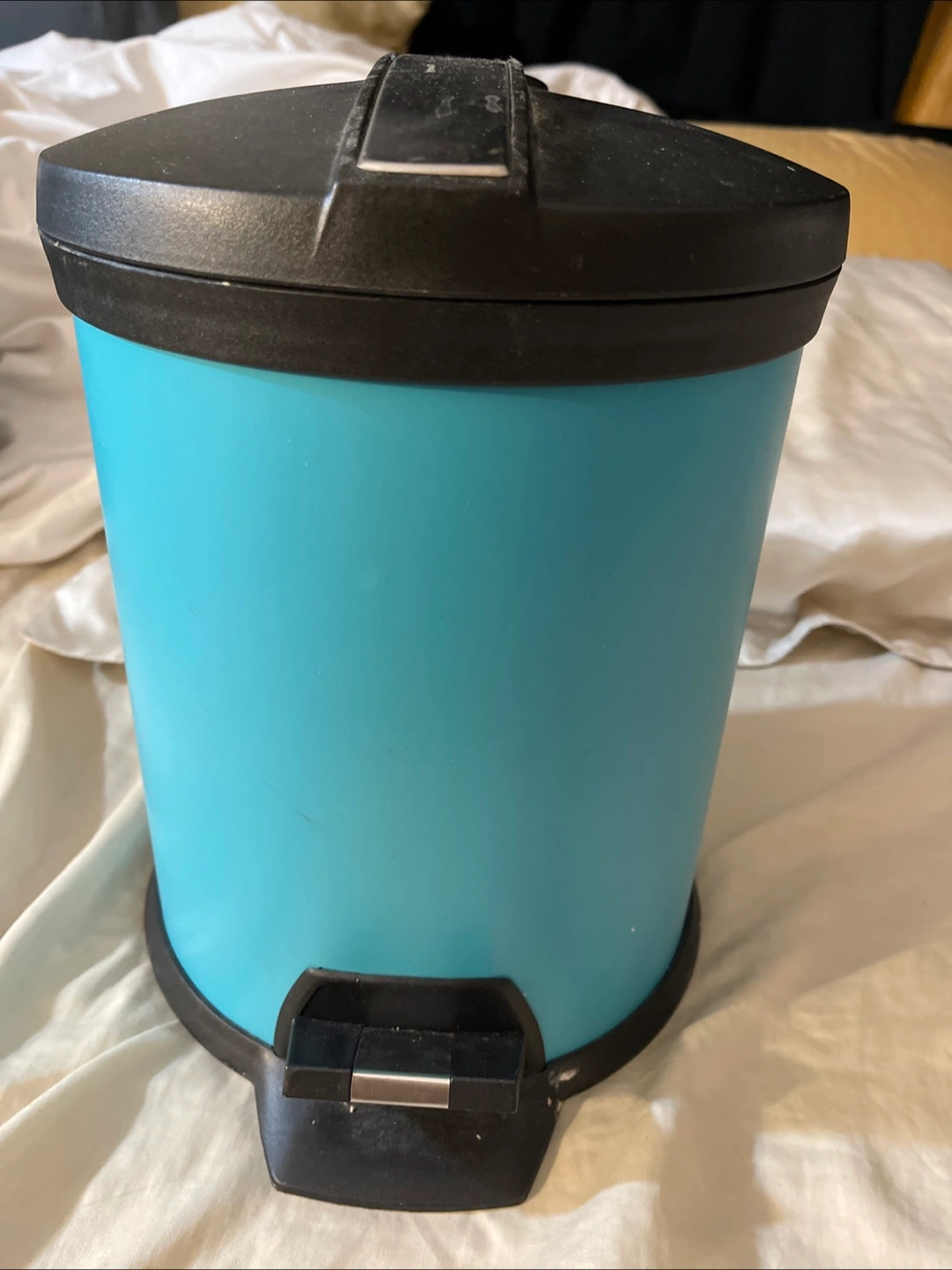 1000+Blue, cylindrical trash can. The lid is black, as is the pedal. A great way to keep your space tidy.