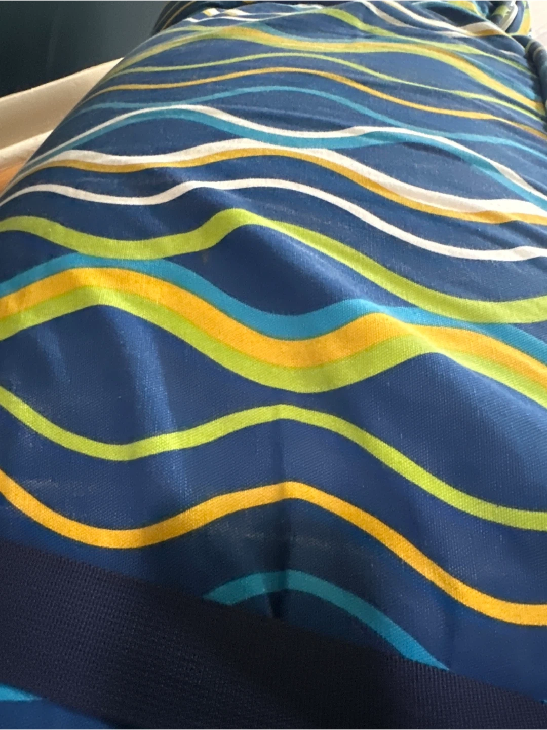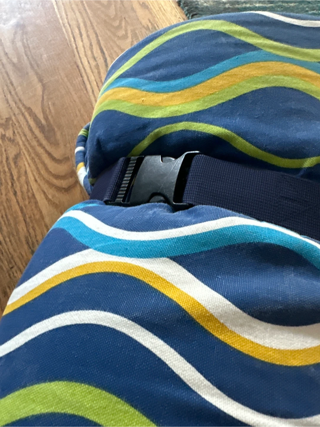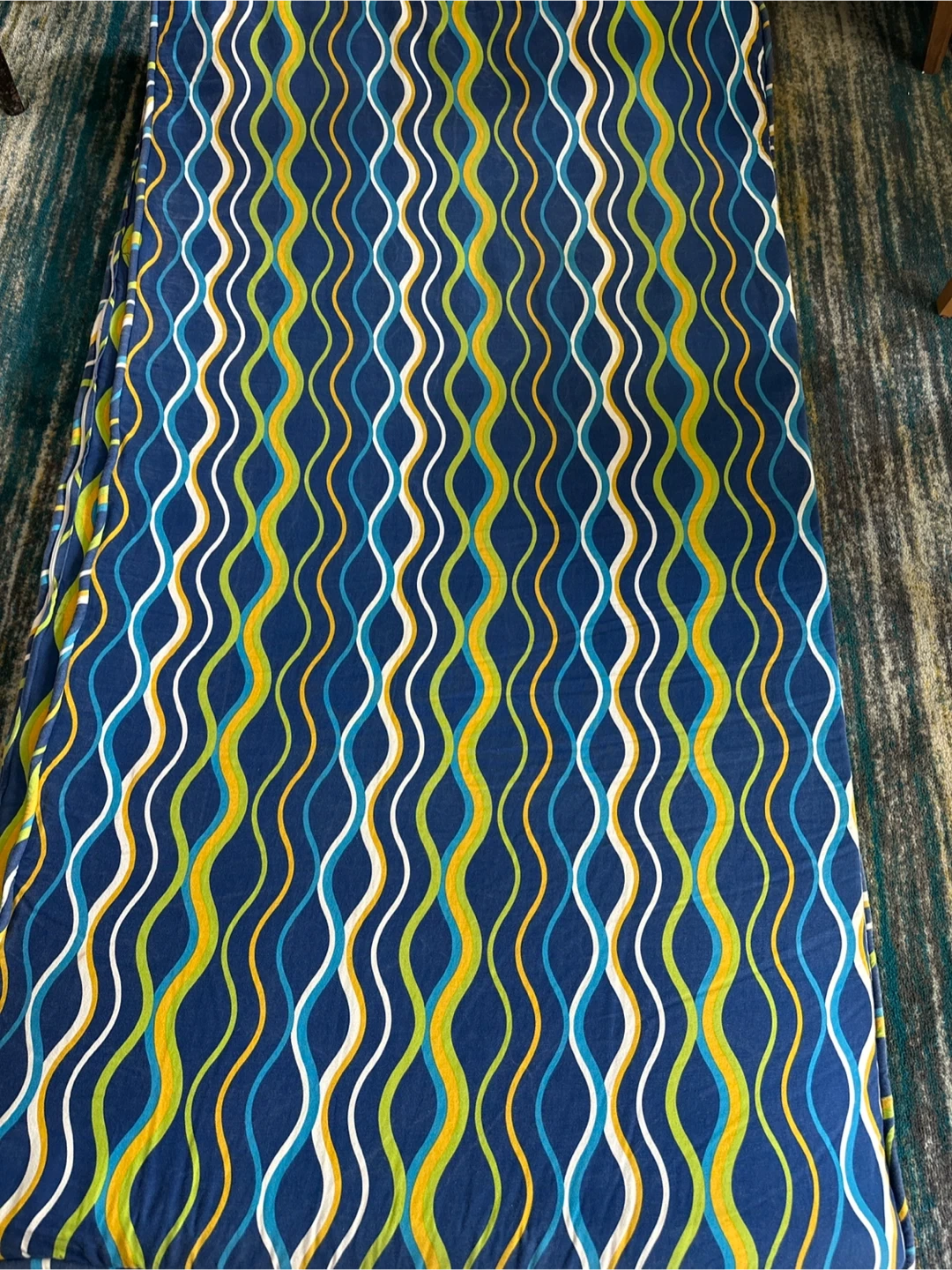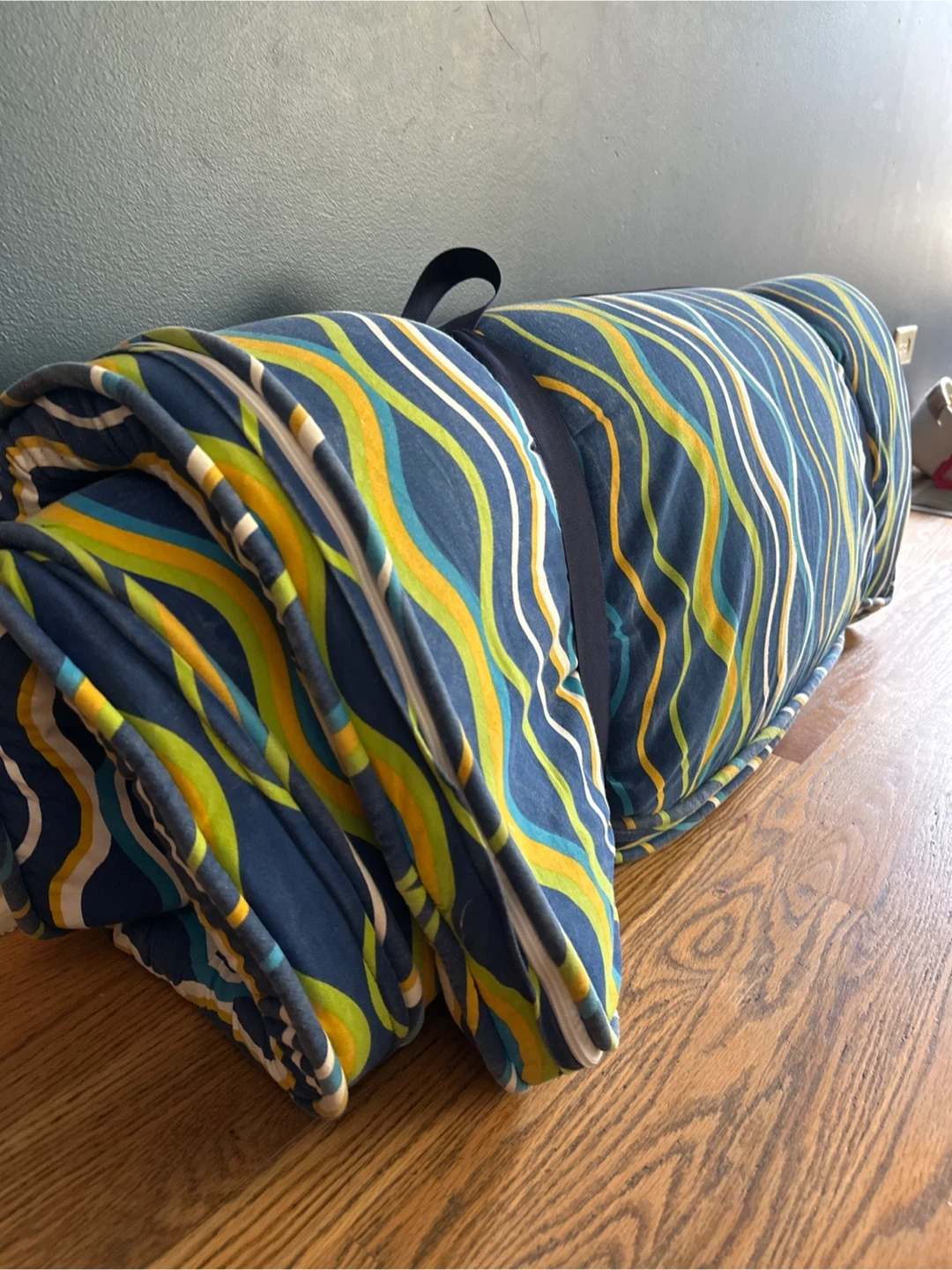 This memory foam sleeping pad features a blue striped design with yellow, white, and green accents. It rolls up easily and has a strap for convenient carrying strap. Washable cover- twin size.