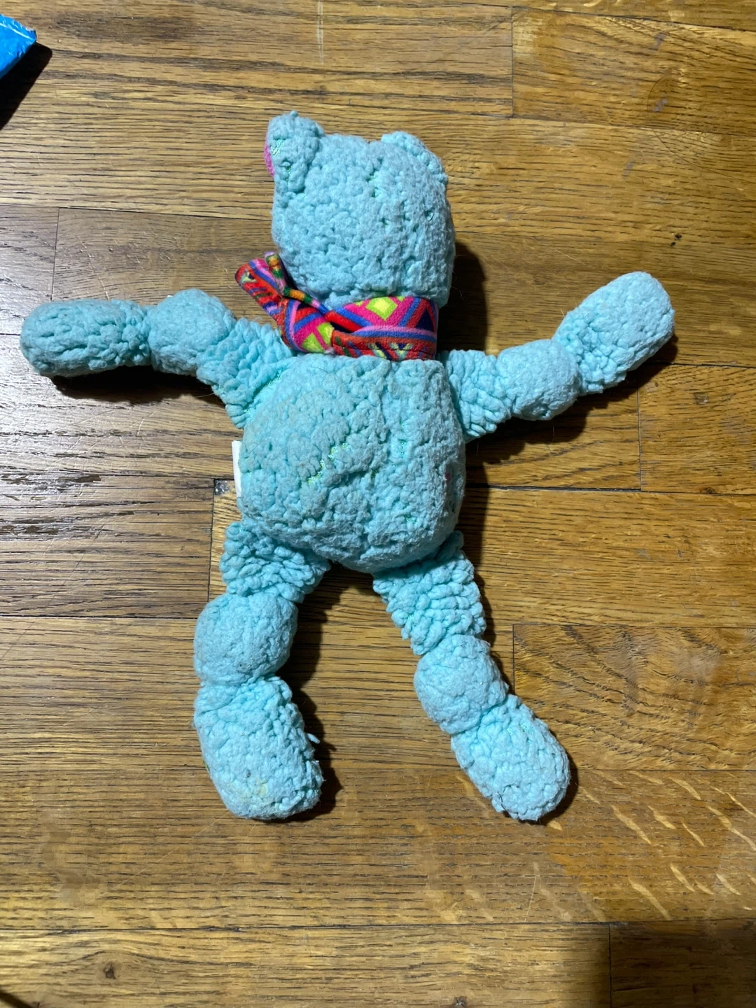 Donating a cute blue stuffed animal toy! It has a colorful scarf around its neck. It's in good condition, squeaker intact and working. Ready for a new home