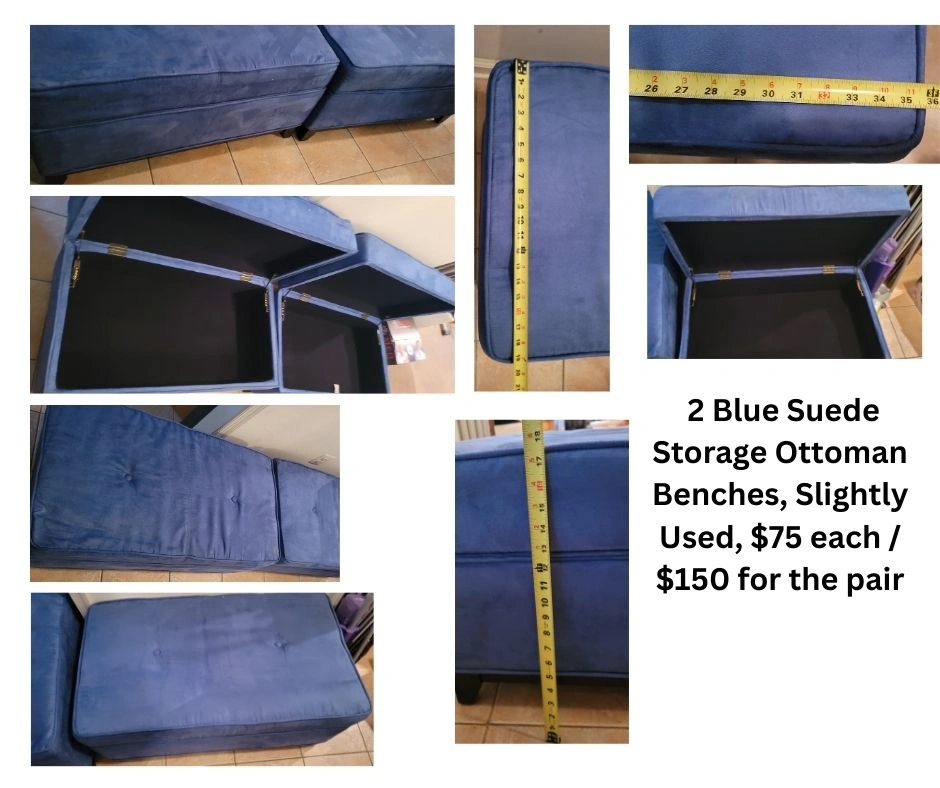 Selling a pair of blue suede storage ottoman benches. They're slightly used and come with a convenient storage compartment inside. One bench is about 35 inches wide, and the other is about 17 inches tall. Perfect for adding extra seating and storage to your home! $75 each, $150 for the pair