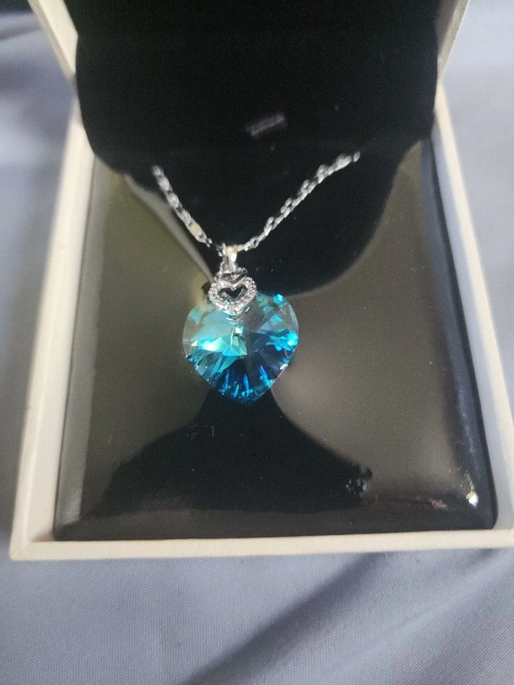 Silver necklace with blue Swarovski crystal. Double Silver heart attachment. Material: Silver Color: Blue Style: Charm Brand: Plato H