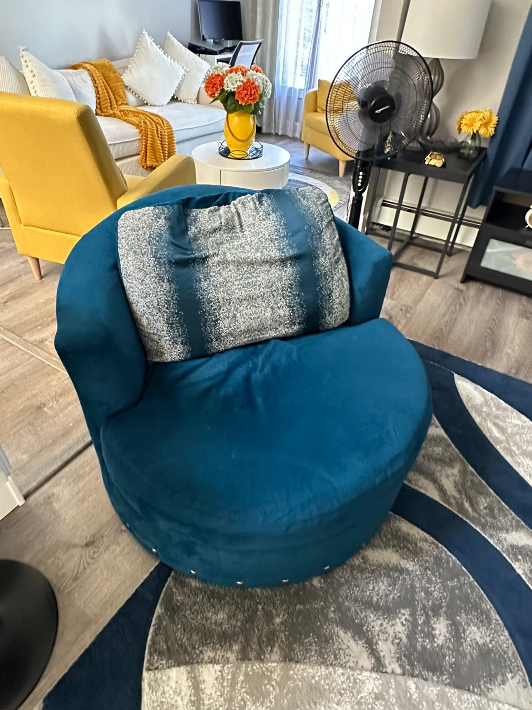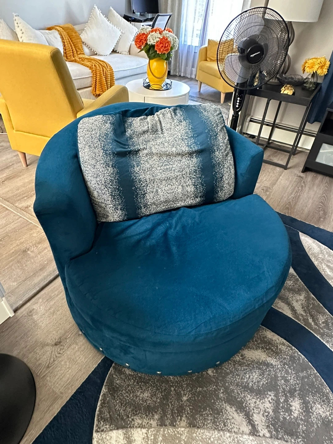 10Here's a comfy blue swivel barrel chair! It's in great condition and would be a cozy addition to any room