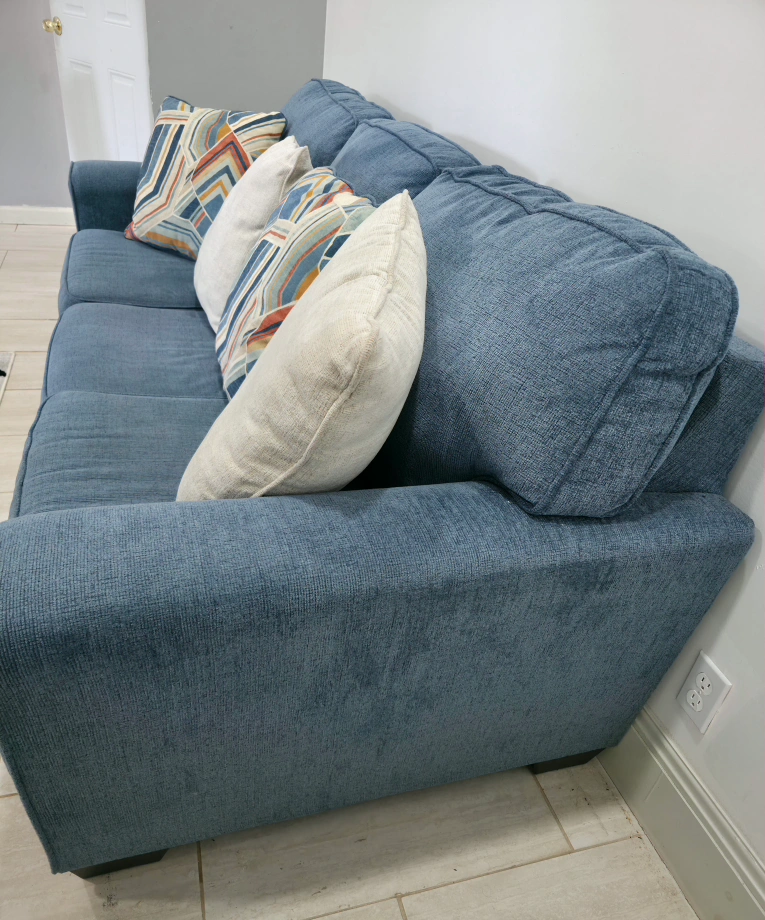 Selling a comfortable blue three-seat sofa in good condition. It's perfect for a living room or den. The sofa has a nice, soft texture and comes with the throw pillows shown in the pictures. It's a great piece to add some color and comfort to your home