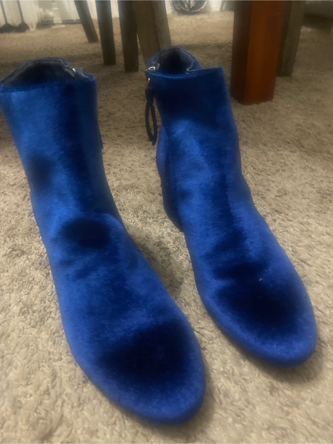 21These are a pair of stylish blue velvet ankle boots. They are in good condition and ready for a new home! The rich blue color and soft velvet material make them a standout piece for any wardrobe