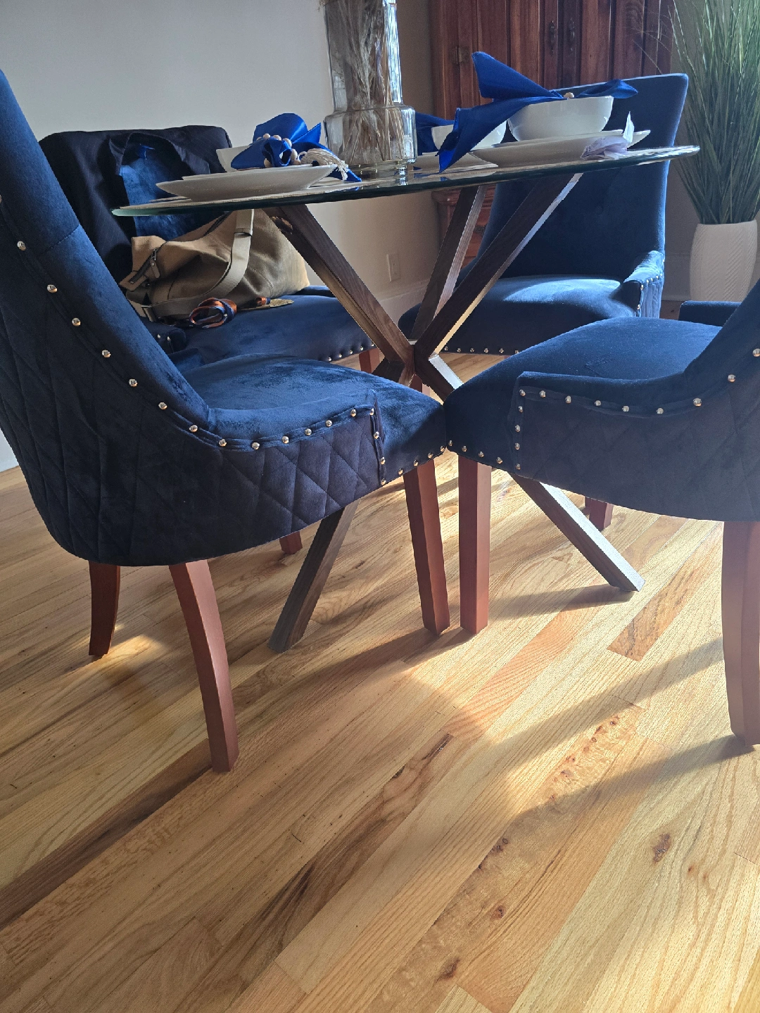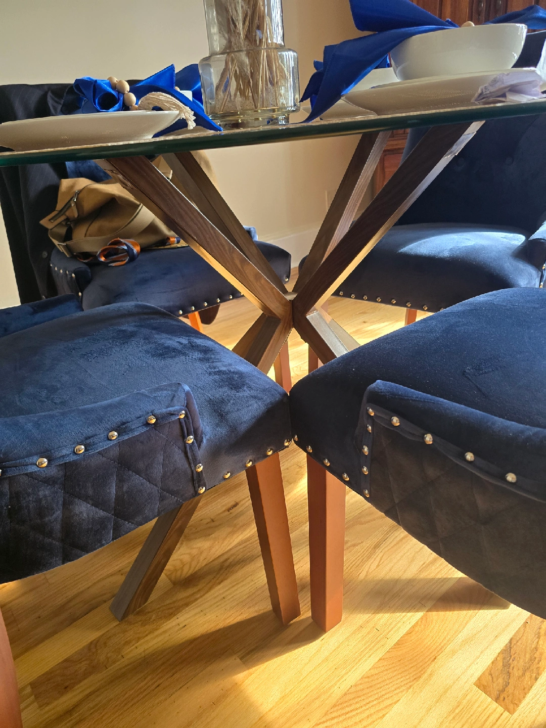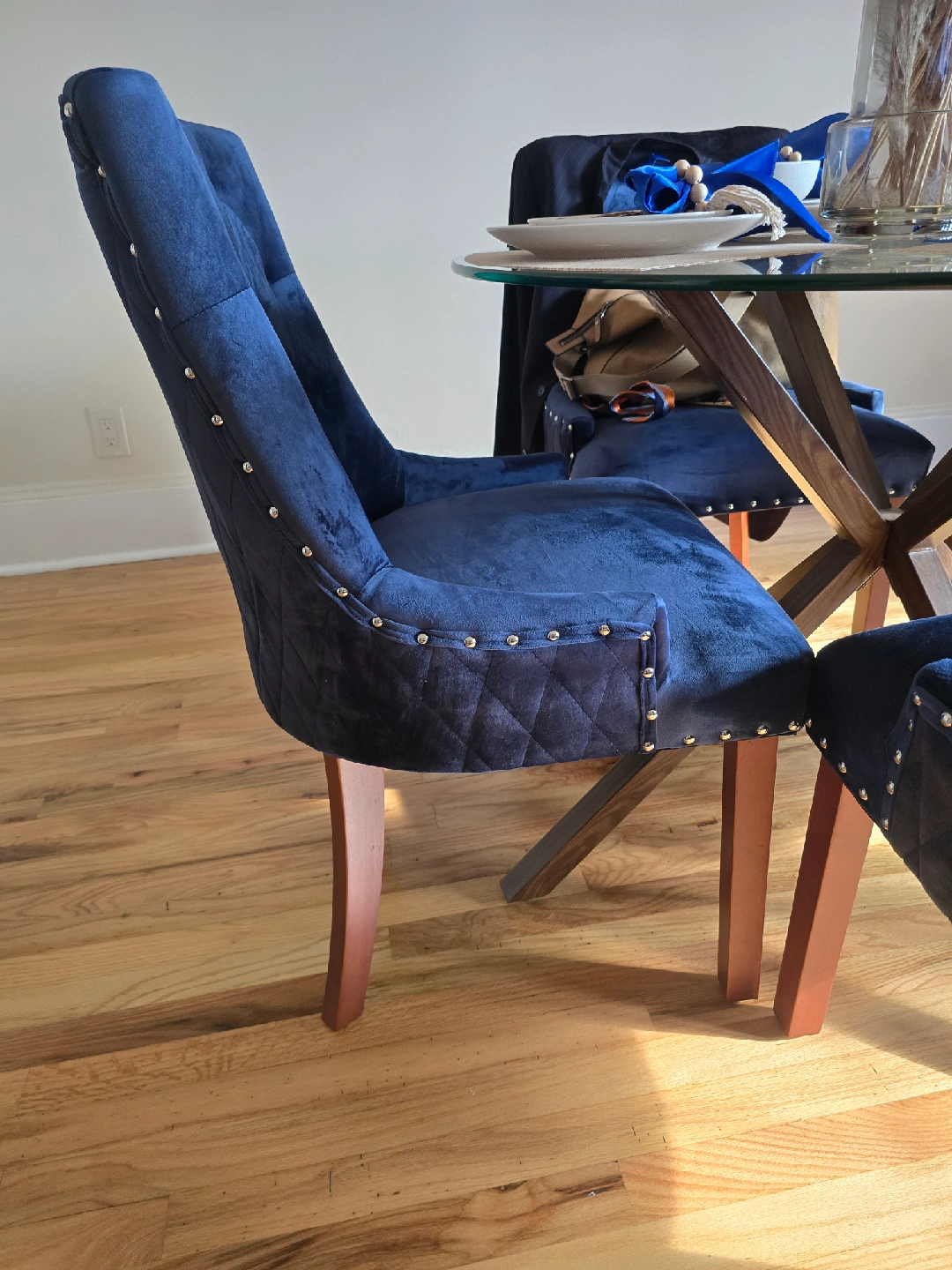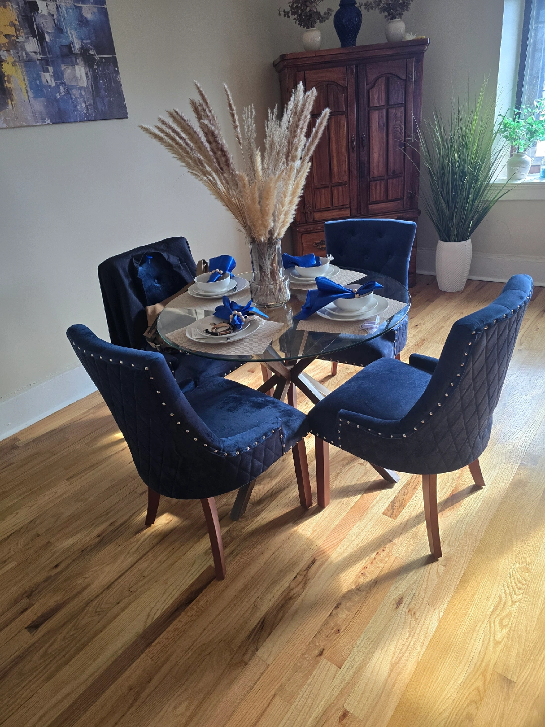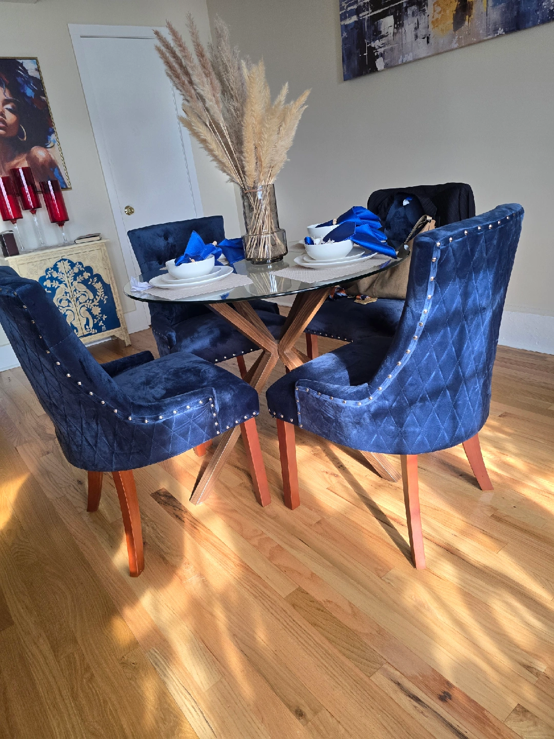 Selling a set of four beautiful blue velvet dining chairs. They have a stylish, modern look with a quilted pattern and studded detailing. These chairs would look great in any dining room or kitchen!