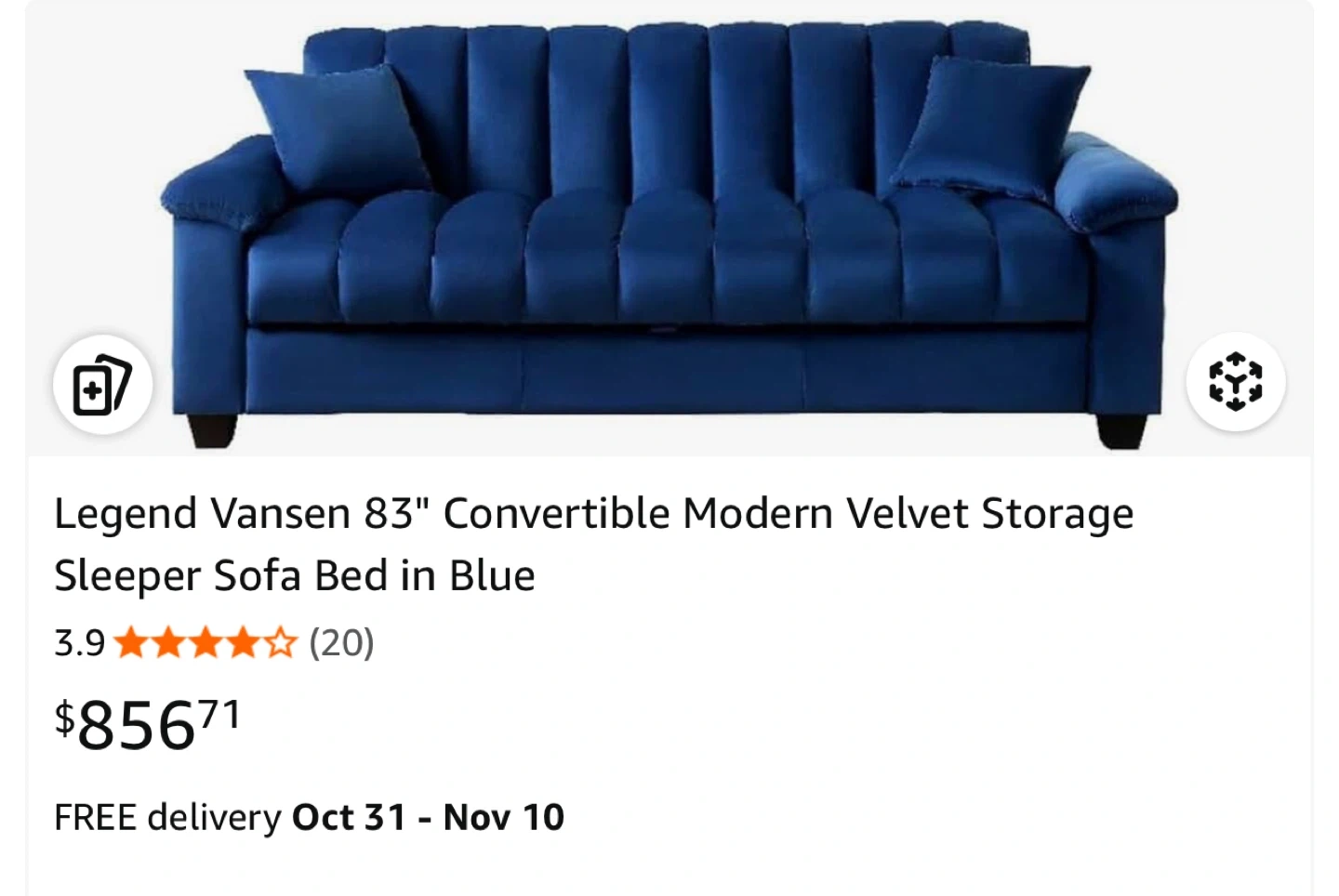 60Selling a Convertible Velvet Storage Sleeper Sofa Bed in blue! It's a stylish and functional piece, perfect for adding a pop of color and extra sleeping space to your home. Originally bought for $856.71 it’s like new in a very good condition I’ve had it for less than a year
