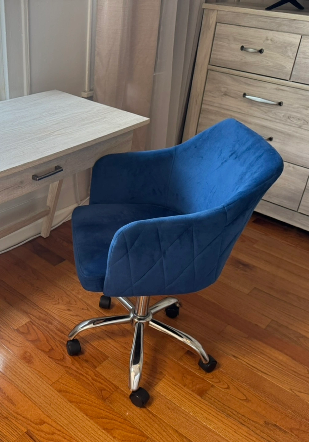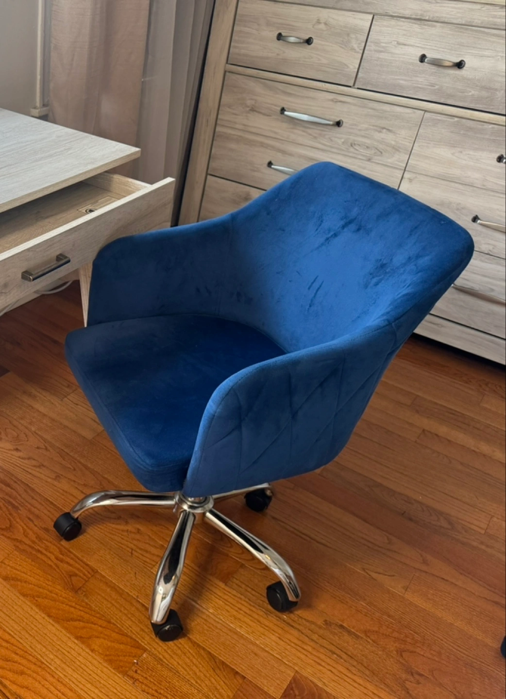 15Modern blue velvet swivel chair with a soft, cushioned seat and backrest for comfort. Features a sleek chrome base with wheels for easy mobility. Perfect for desk, office, or home use.