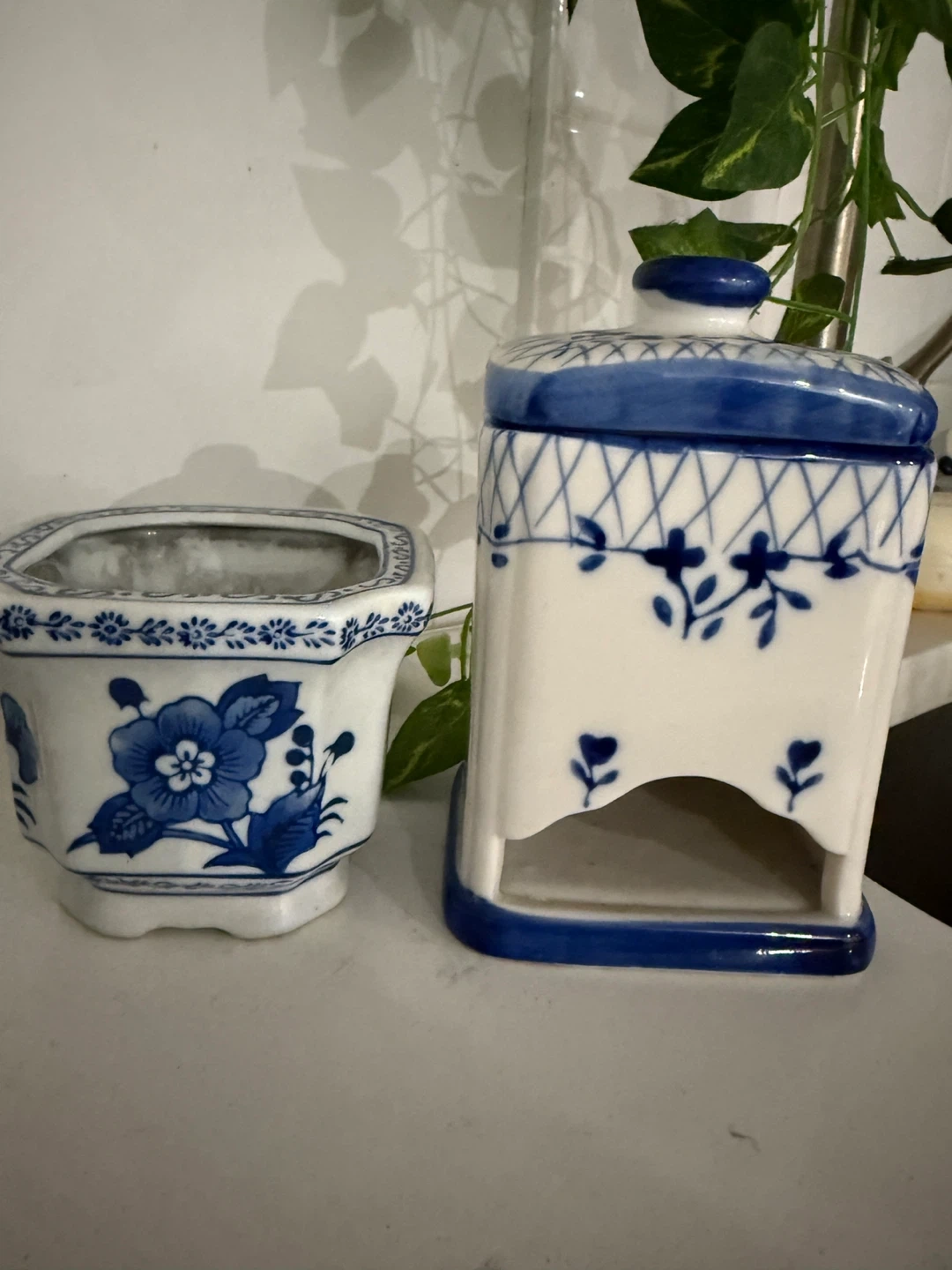 334Selling a cute set of blue and white porcelain items! Included is a flower pot with a blue floral design and a matching jar with a lid. They would make a lovely addition to any home!