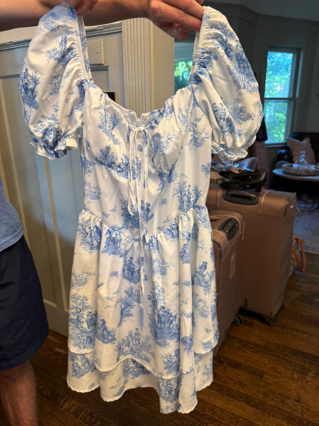 Selling a cute dress with a blue and white toile pattern. It has a tie at the front and a tiered skirt.