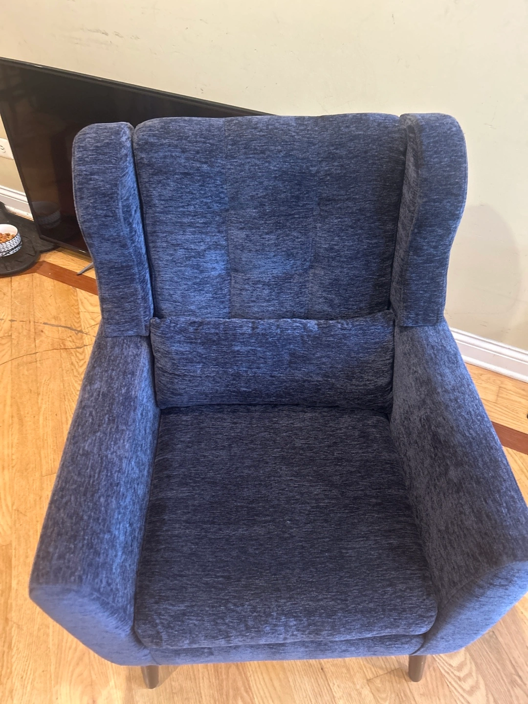 Here's a comfy blue wingback armchair! It's in great condition and ready for a new home. The chair features a classic wingback design, perfect for adding a touch of elegance to any room. It's a great spot to relax and unwind after a long day!