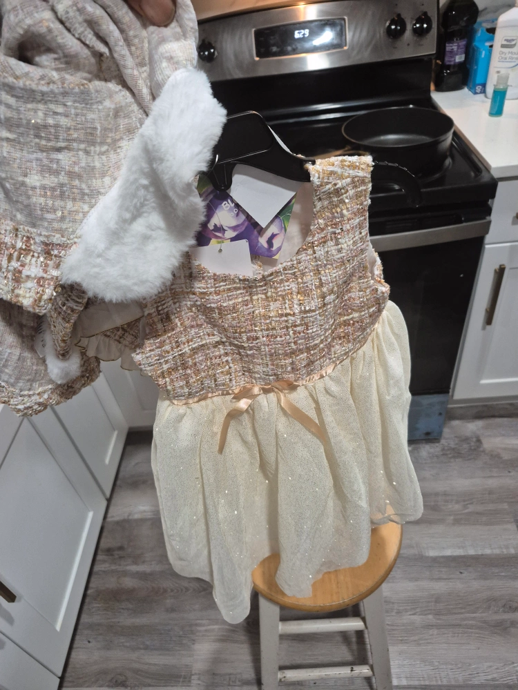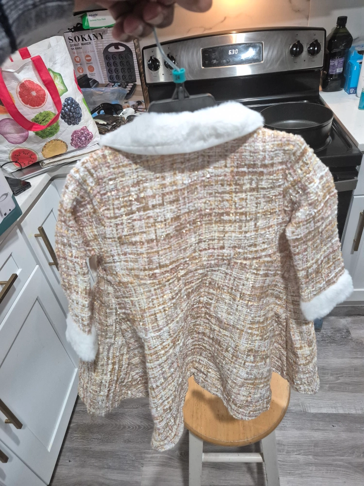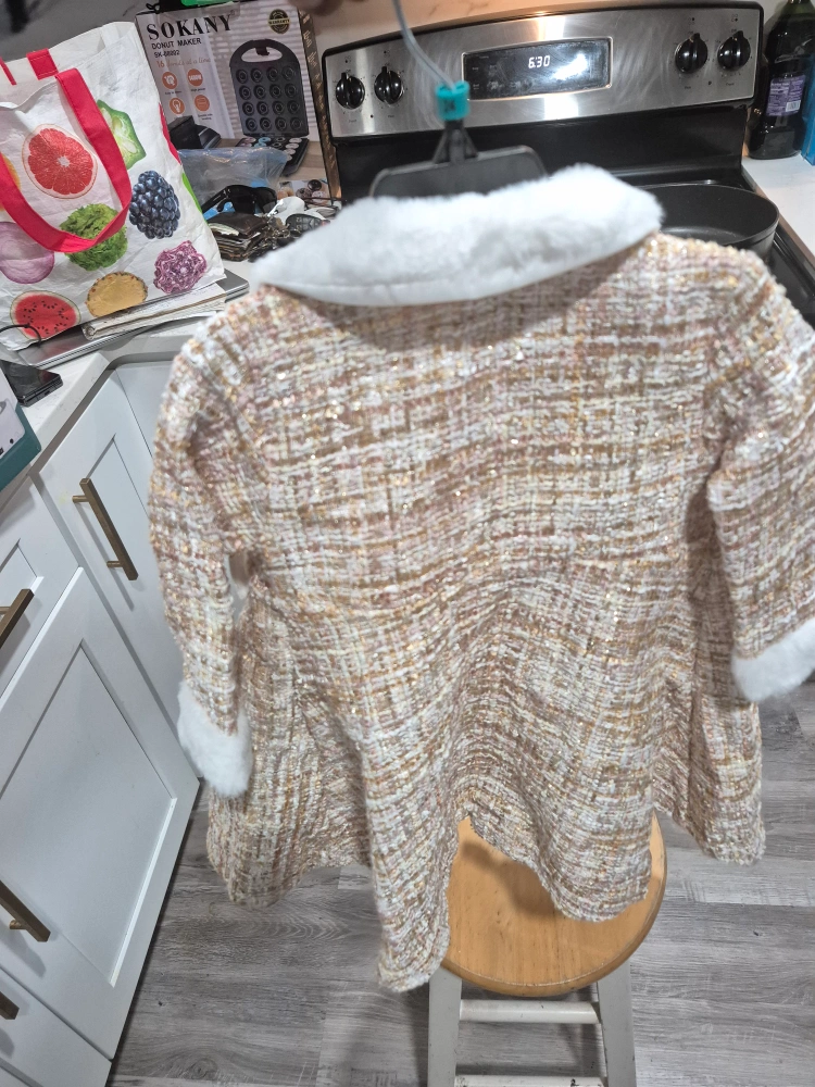 This adorable dress and jacket set from Blueberry Boulevard is perfect for your little one! The jacket features a soft, white faux fur collar and cuffs, paired with a matching dress with a sparkly skirt. The dress and jacket are made from a woven material with gold and white threads. I have 2 identical outfits if you have twin girls , cousins, nieces or god daughters. And I will sell both for $34.