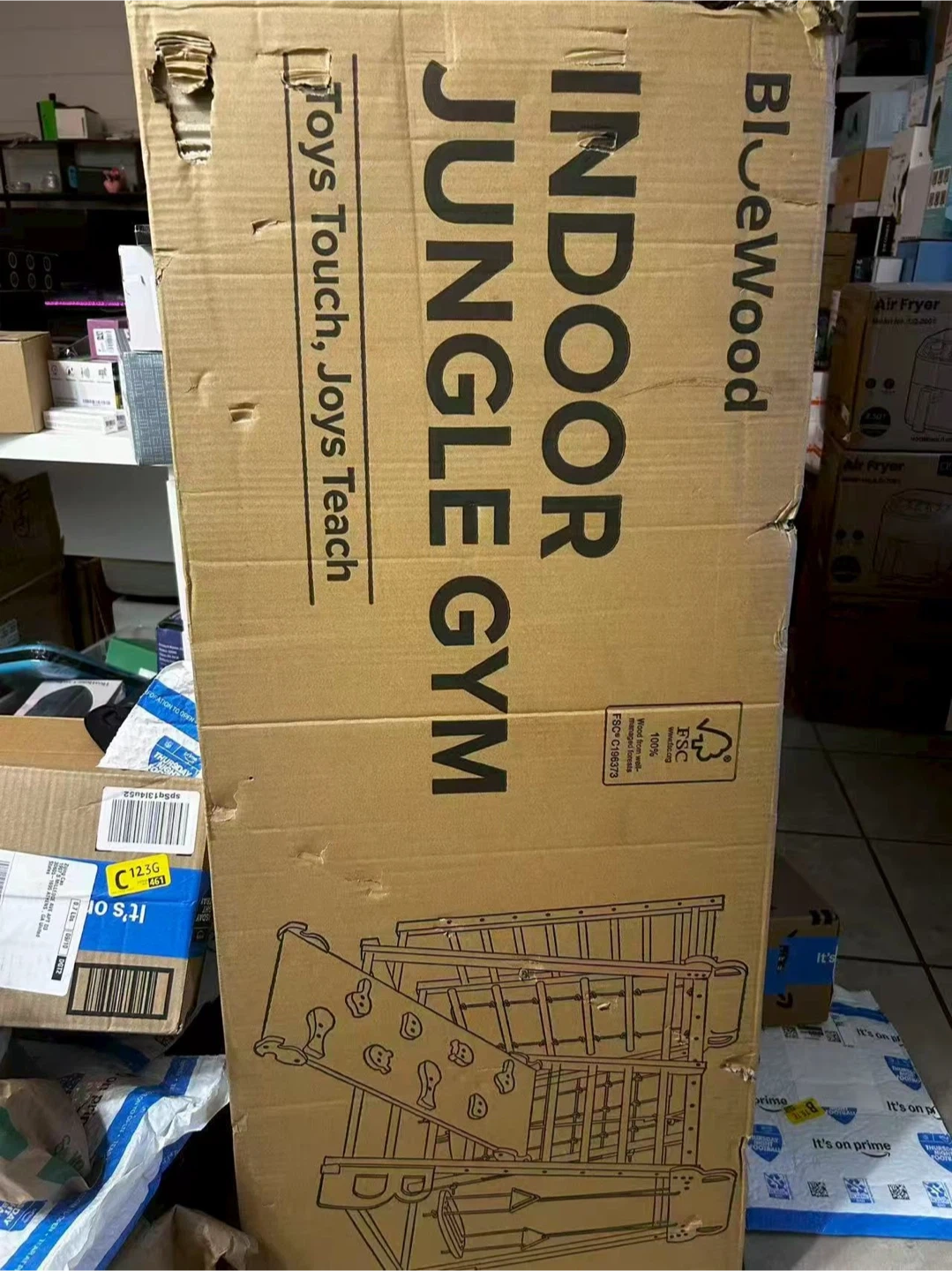 This is a Bluewud Indoor Jungle Gym, perfect for kids who love to climb and explore! It's an upgraded indoor playground with 9-in-1 features, including a slide, swing, monkey bars, upright/rope ladder, and climb net. Crafted with care, it's designed for adventurers and promises fun beyond compare! The dimensions are approximately 59.1" x 37.8" x 46.1". Brand new in box