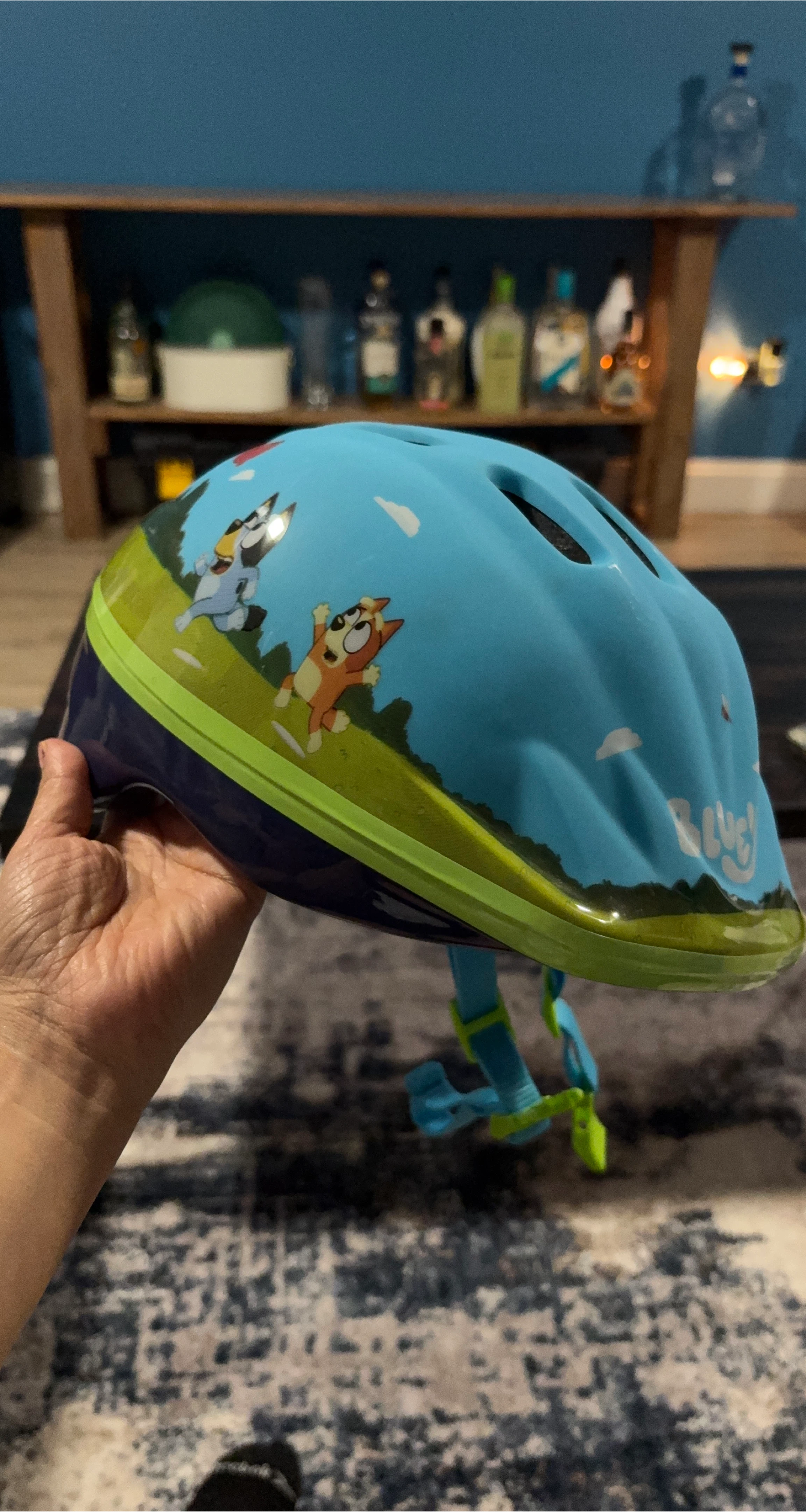Here's a cute Bluey themed kids' bike helmet! It's light blue with a green accent and Bluey characters on the side