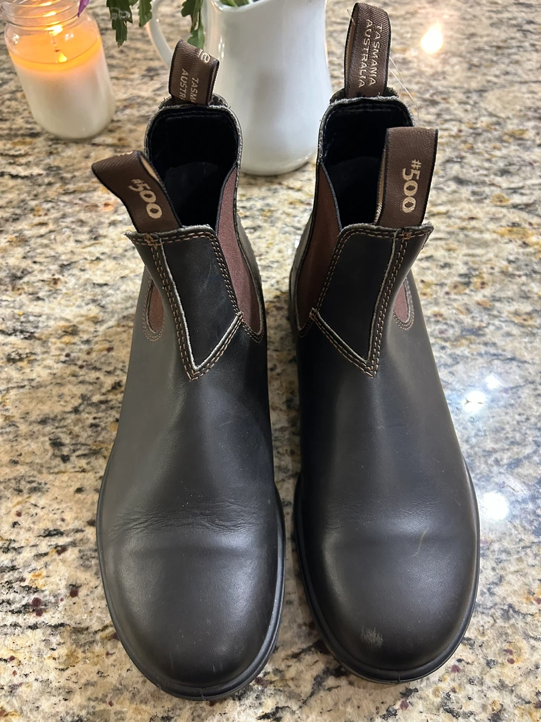 Selling a pair of Blundstone 500 boots. They are made of leather and are in good condition. They are a dark color. Size 9.5