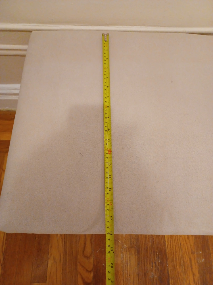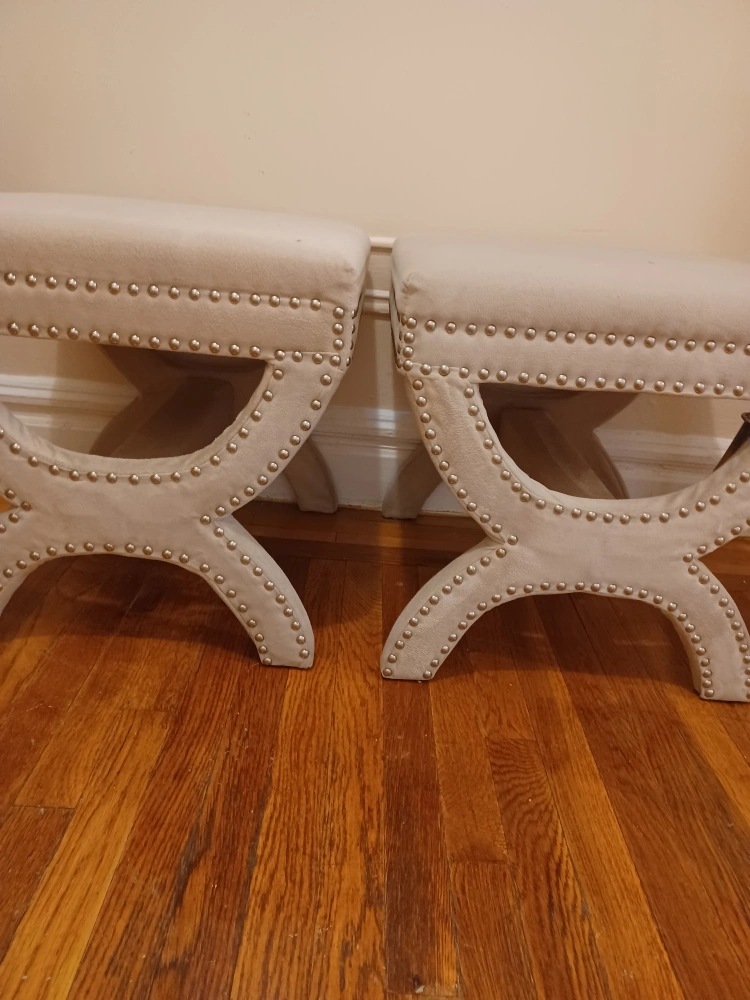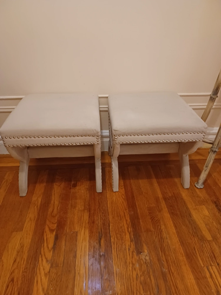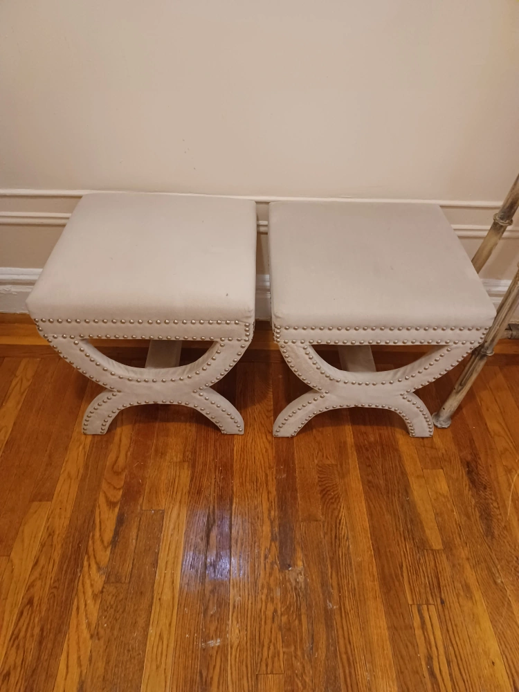 Two beige upholstered stools with silver nailhead trim. The top of each stool measures 18 inches by 18 inches. They are in good used condition. Local pickup only.