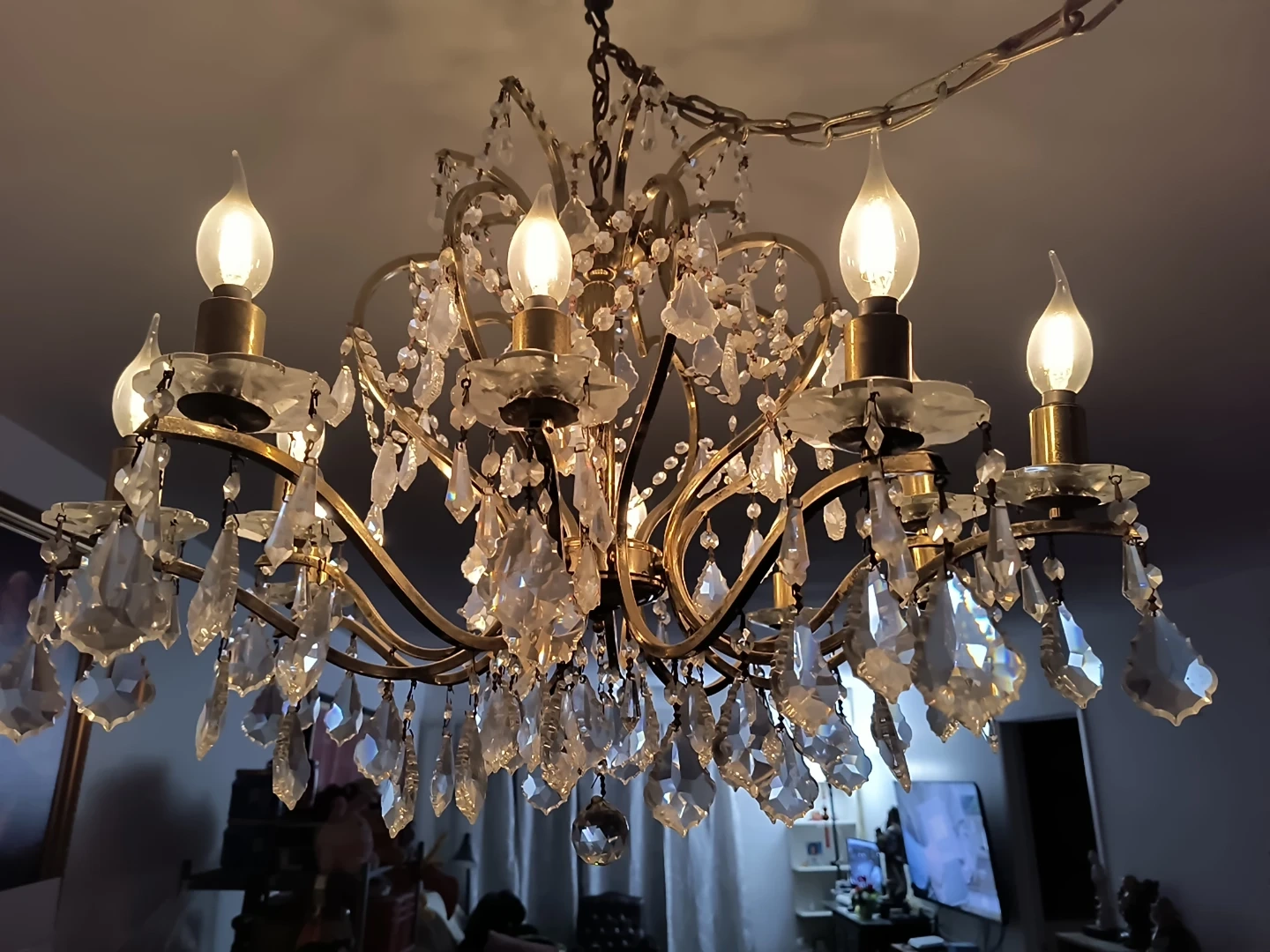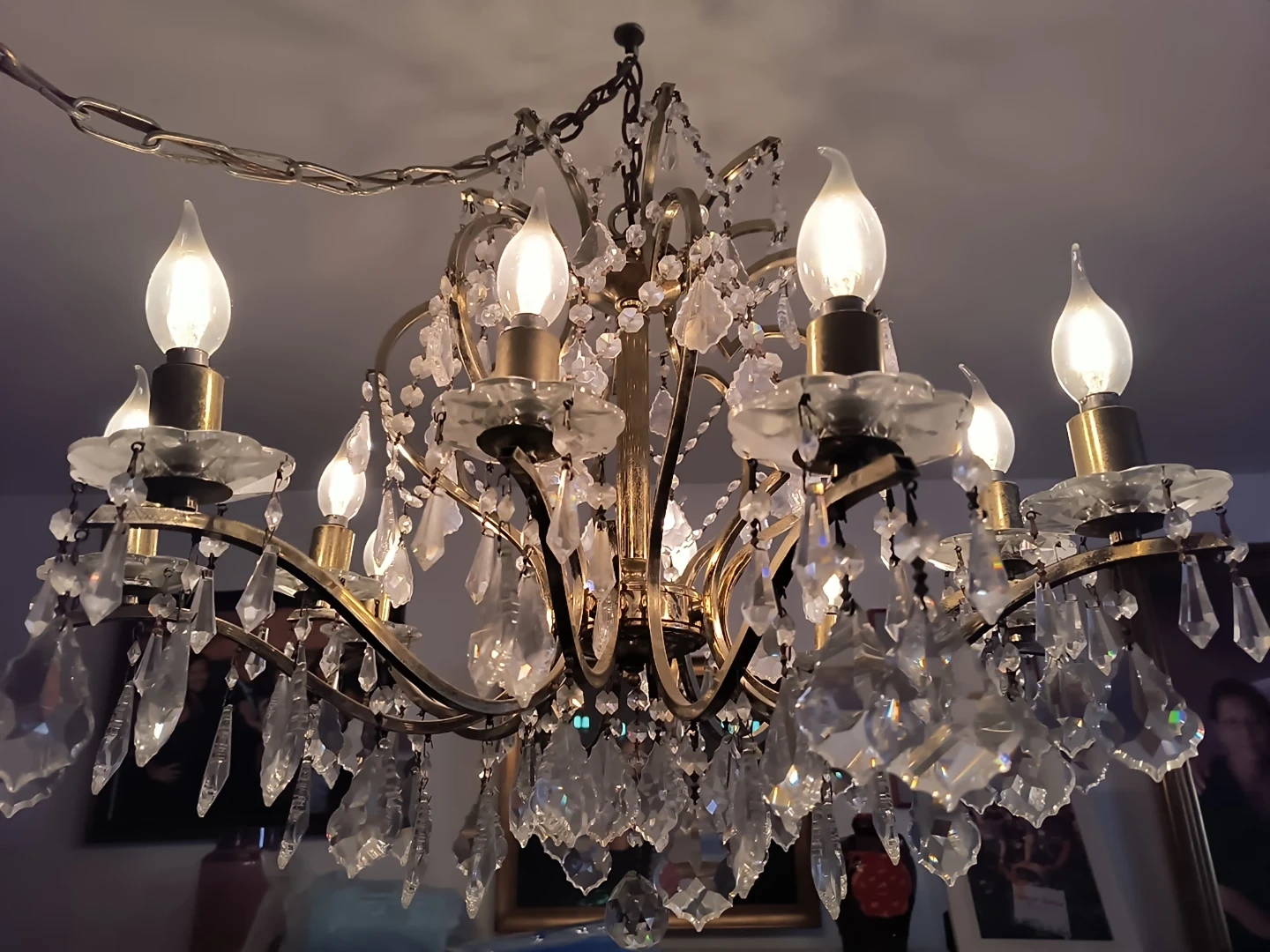 Beautiful crystal chandelier with ornate metalwork. Features multiple light bulbs for bright illumination and cascading crystals for a glamorous look. Adds elegance to any room!