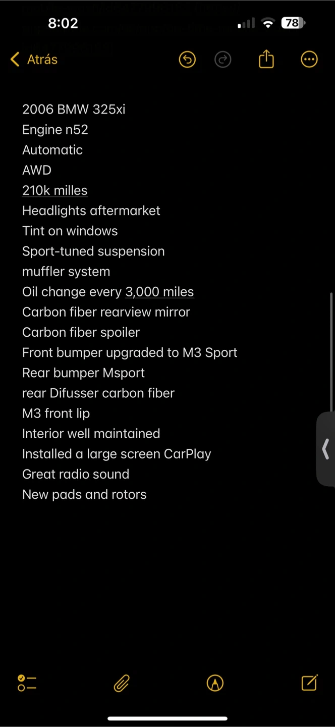 Last photo: description of all the mods and aftermarket parts installed. This car is my daily, it has a lot of love put into it, and I’m selling it because I’m looking for a pickup truck.