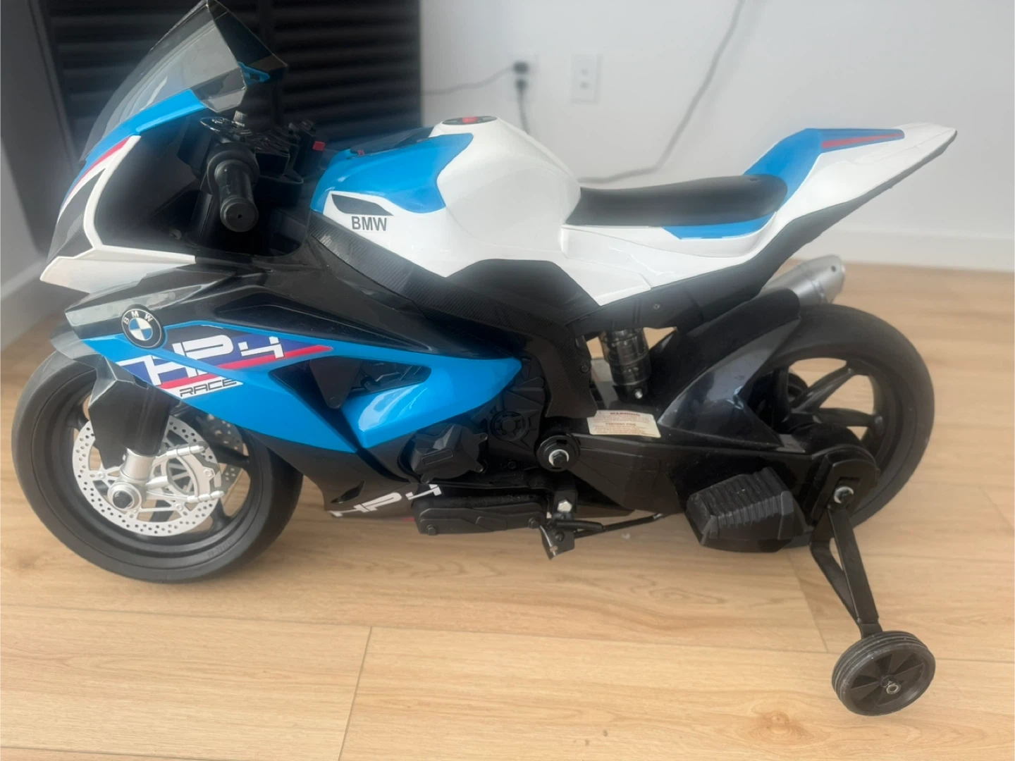 Selling a BMW kids ride on motorcycle! It's in great condition and ready for a new rider. The colors are blue, white, and black, just like the real thing. Perfect for little ones who love motorcycles