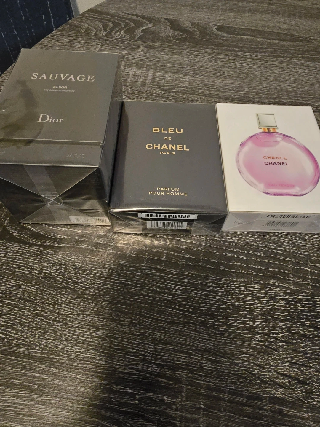 Three designer perfumes are included: Dior Sauvage Elixir, Chanel Bleu de Chanel Parfum Pour Homme, and Chanel Chance Eau Tendre Eau de Parfum. These are new in boxes.