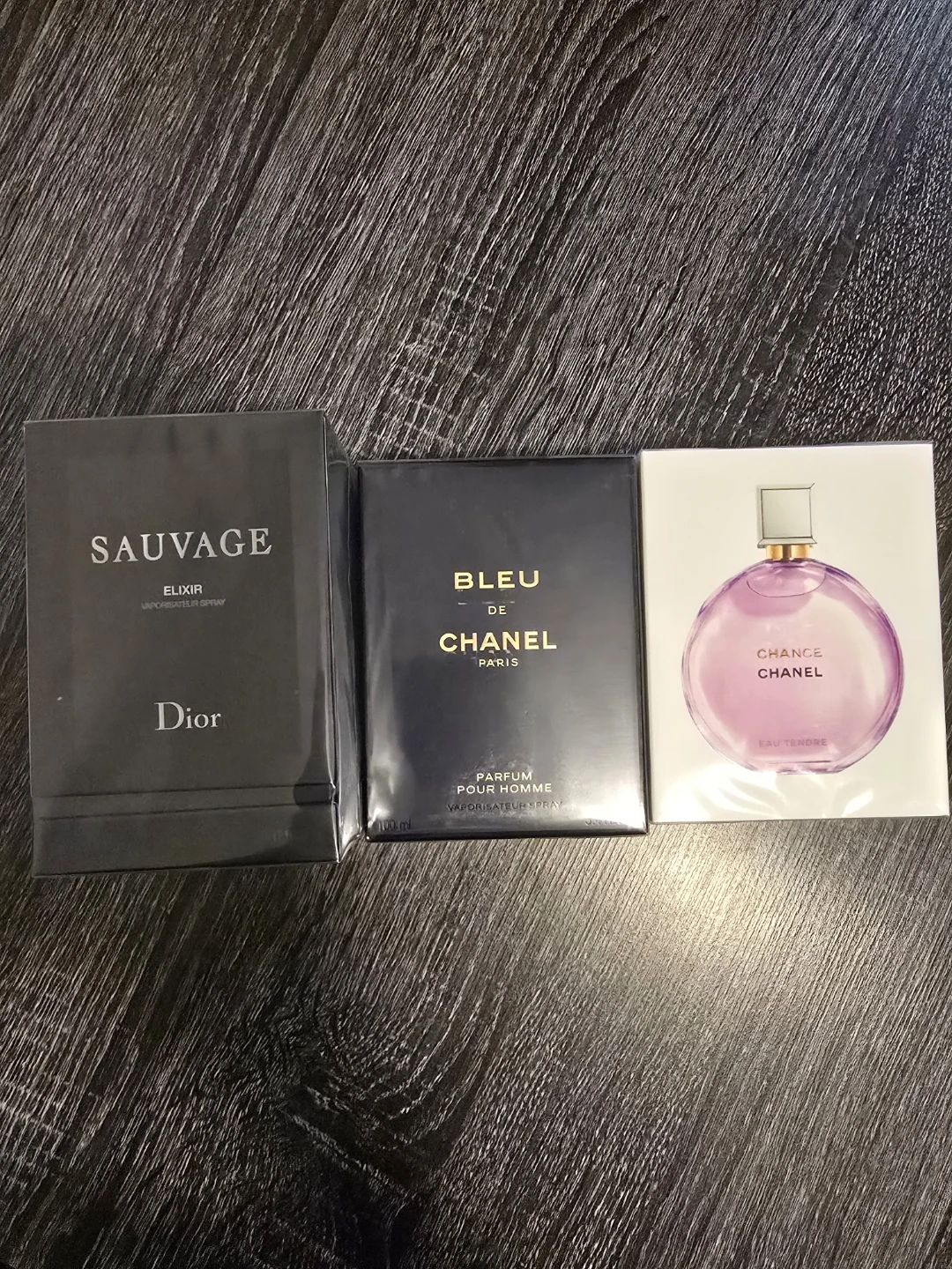 Three designer perfumes are included: Dior Sauvage Elixir, Chanel Bleu de Chanel Parfum Pour Homme, and Chanel Chance Eau Tendre Eau de Parfum. These are new in boxes.