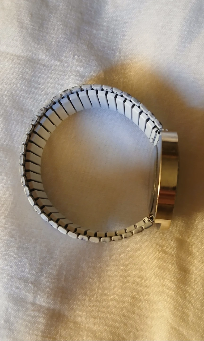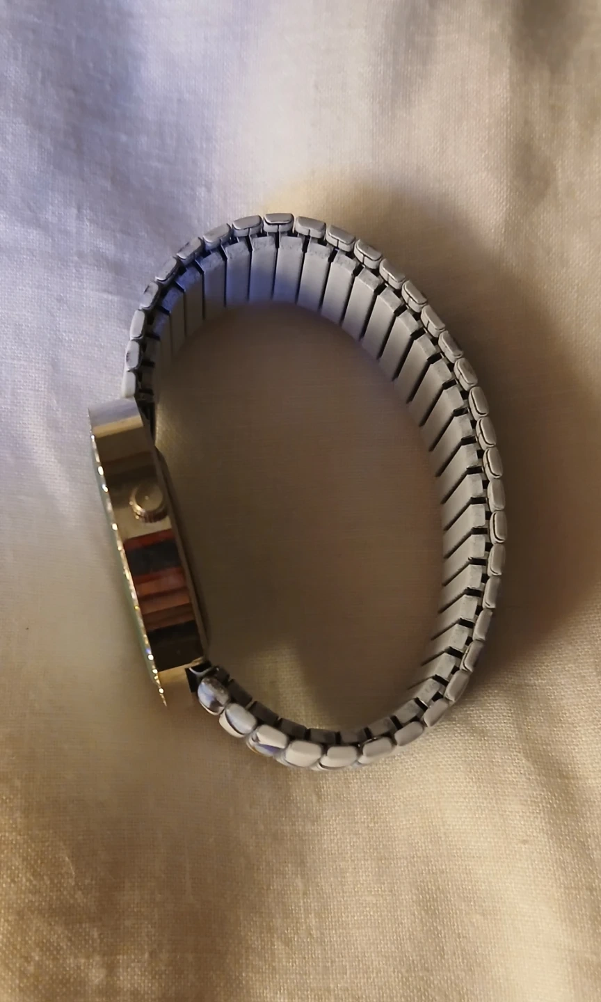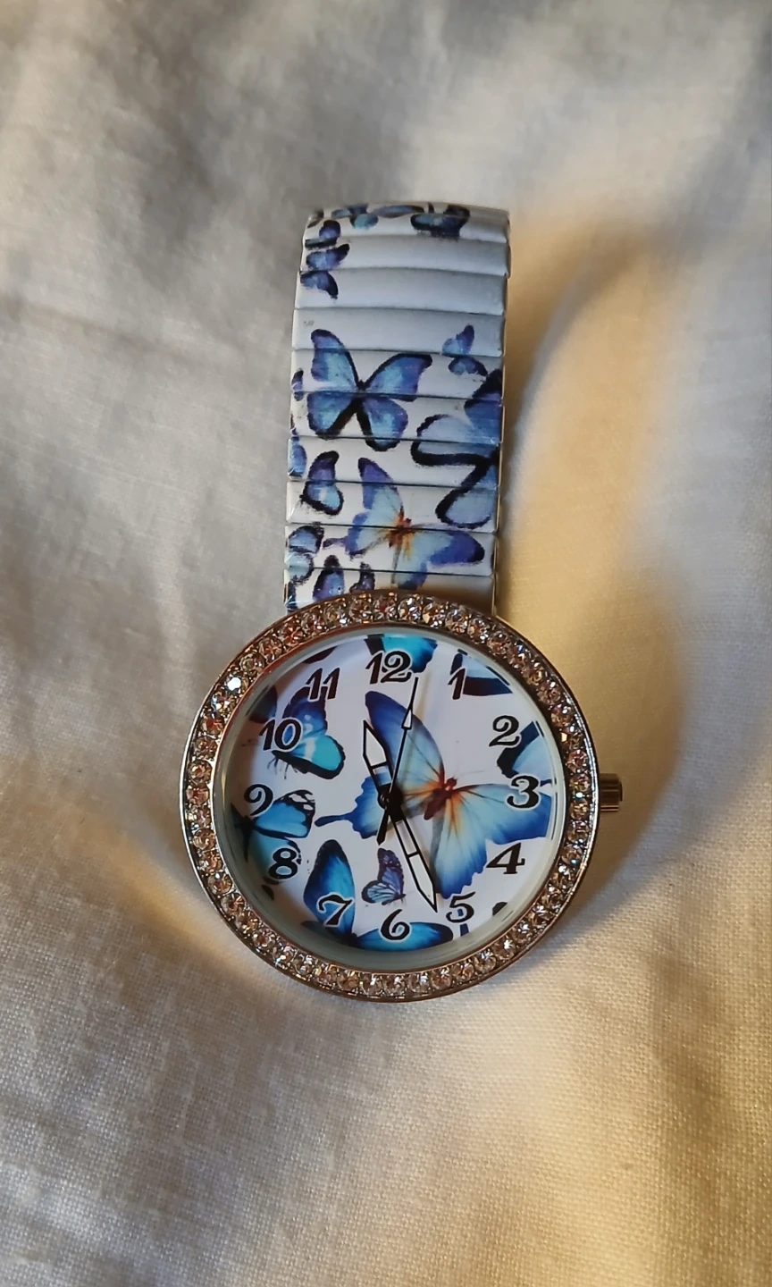What a beautiful gift for someone on your list or yourself. Gorgeous bright blue colors on face and expandable band. Crystal bezel. Stainless steel back. Battery needed.