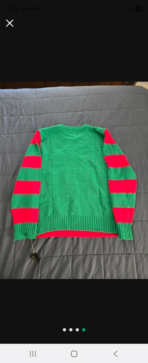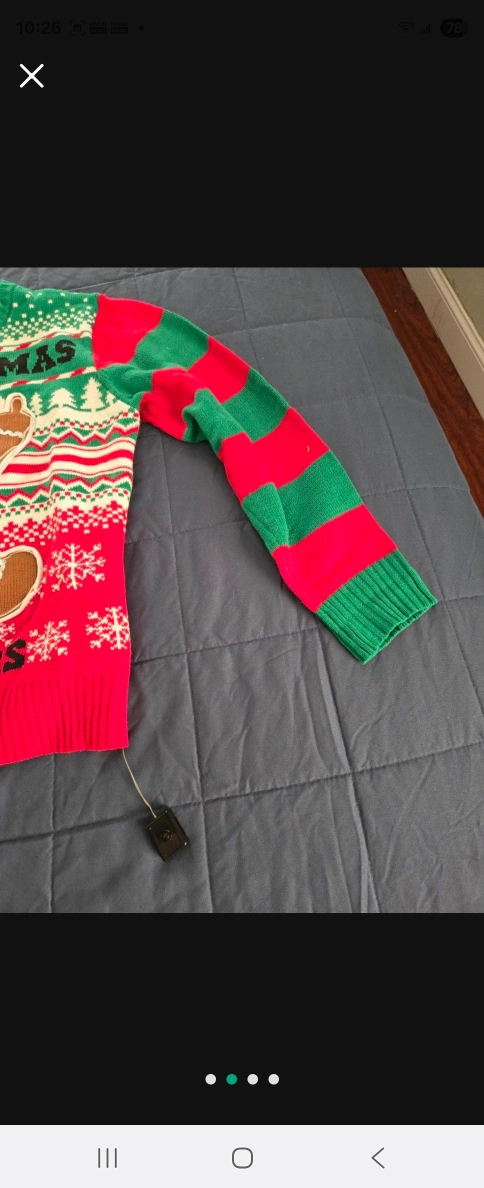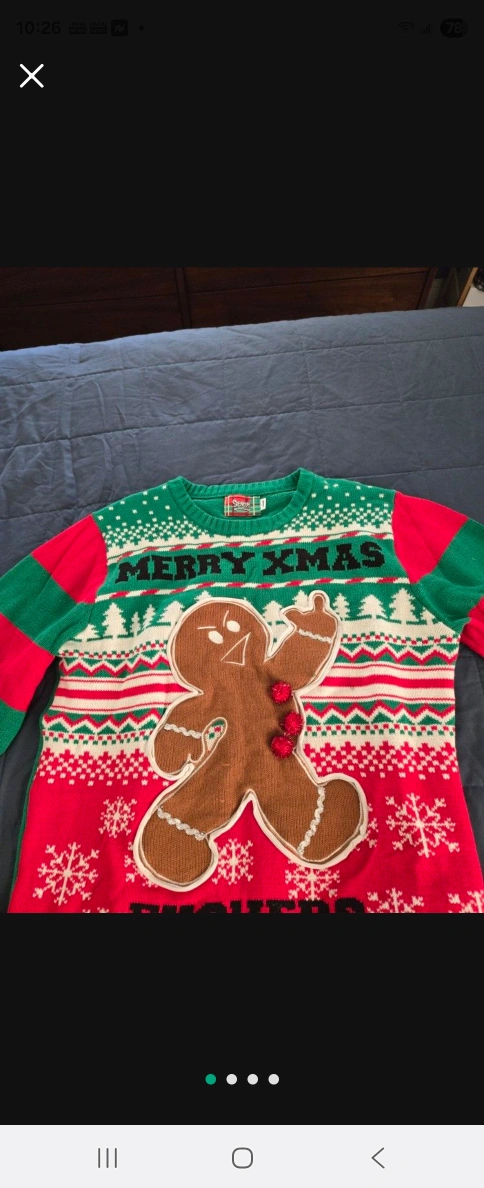 A festive sweater with holiday colors. Green, red, and white detailing. A gingerbread man with some light-up features. Great for staying cozy.