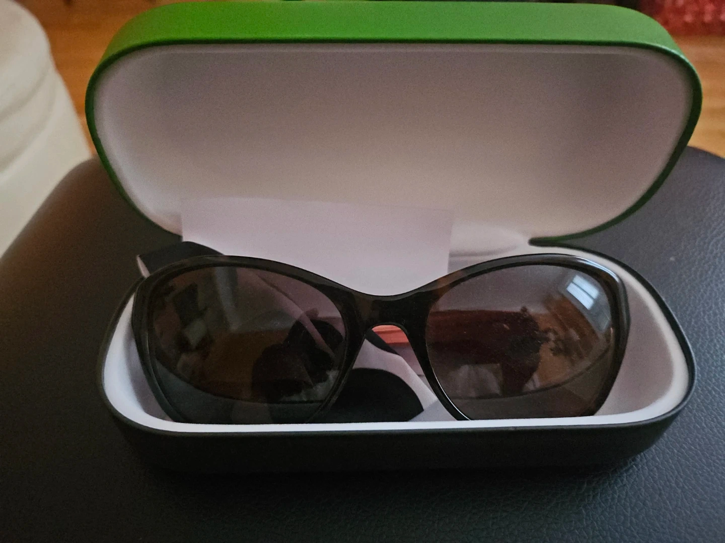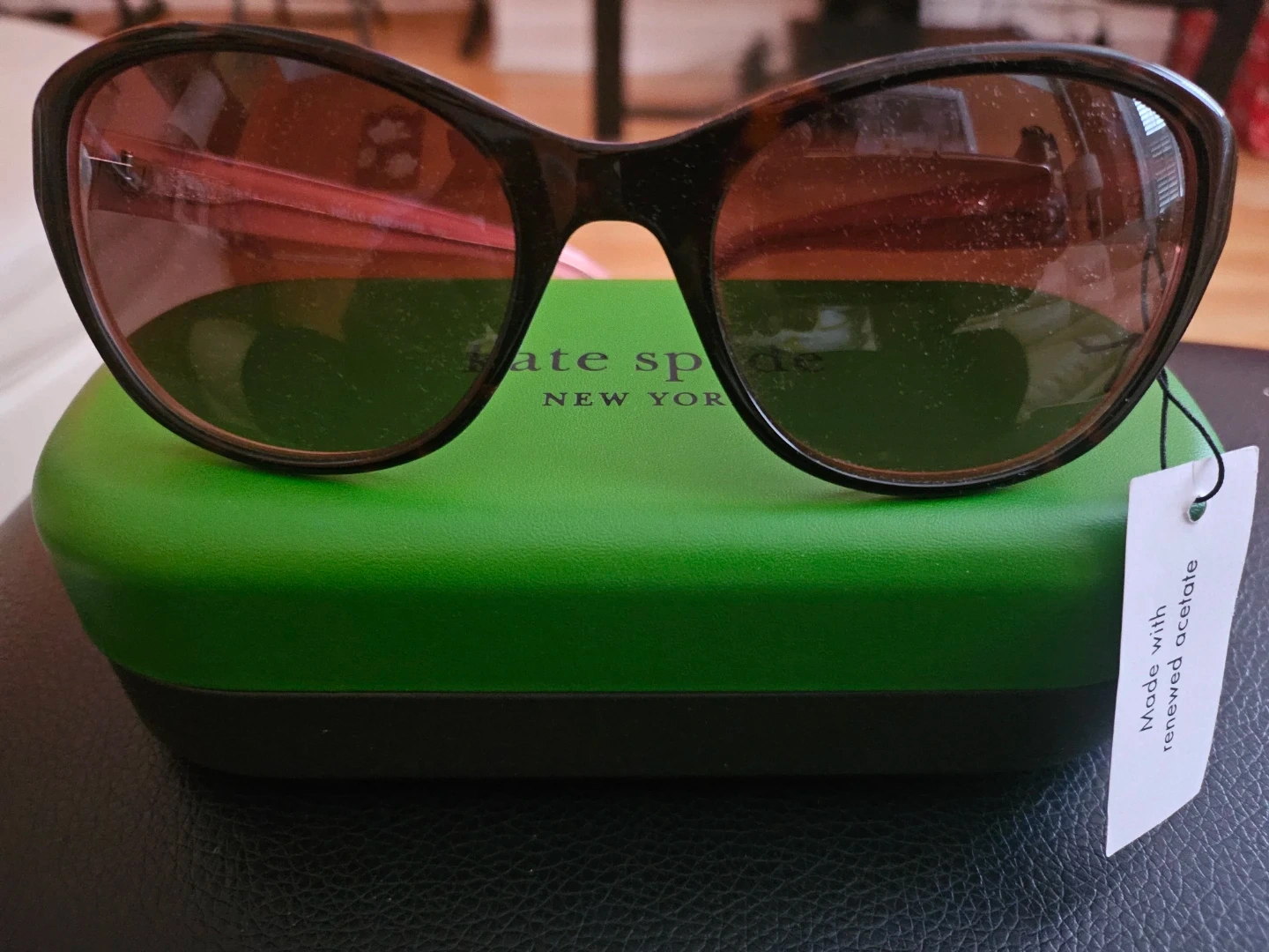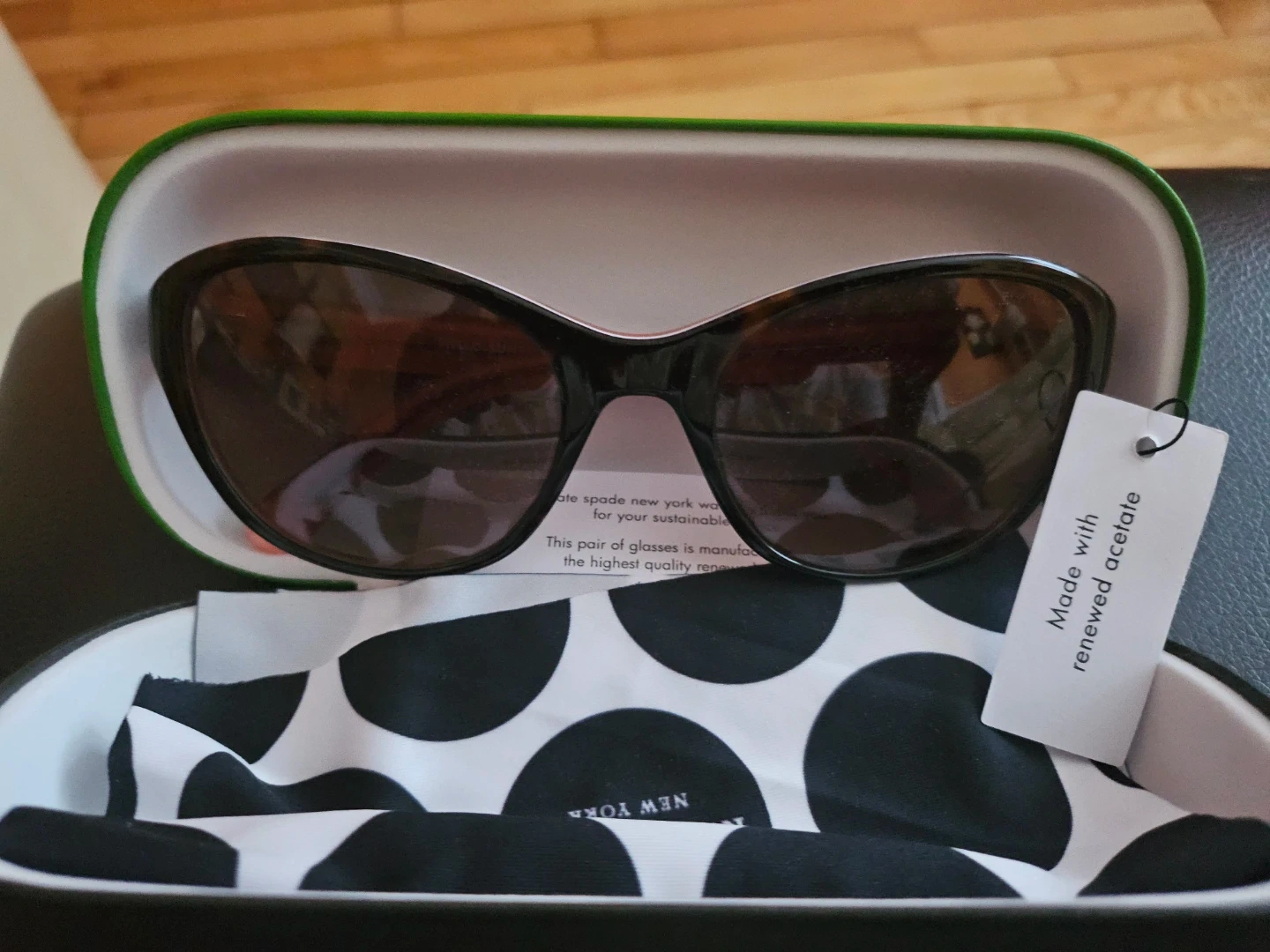 These are Kate Spade New York sunglasses with a tortoise shell frame. They're made with renewed acetate and come with their original case and cleaning cloth. A stylish accessory for sunny days!
