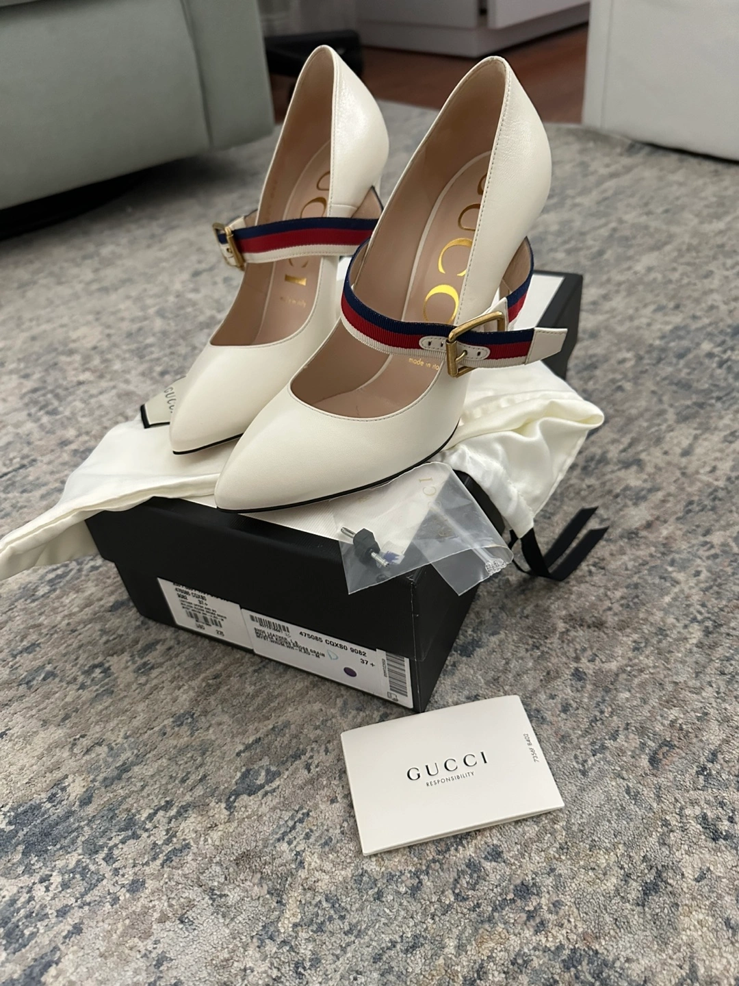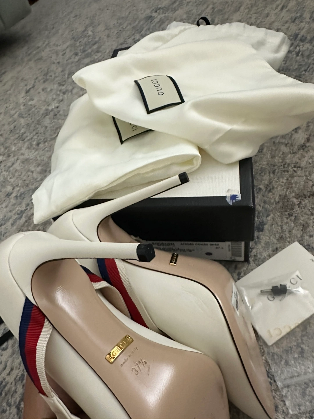 Selling a pair of Gucci leather heeled pumps in size 37.5. These stylish heels feature a unique strap design with the classic Gucci colors. The original box and dust bag are included, and they were originally bought for $275!