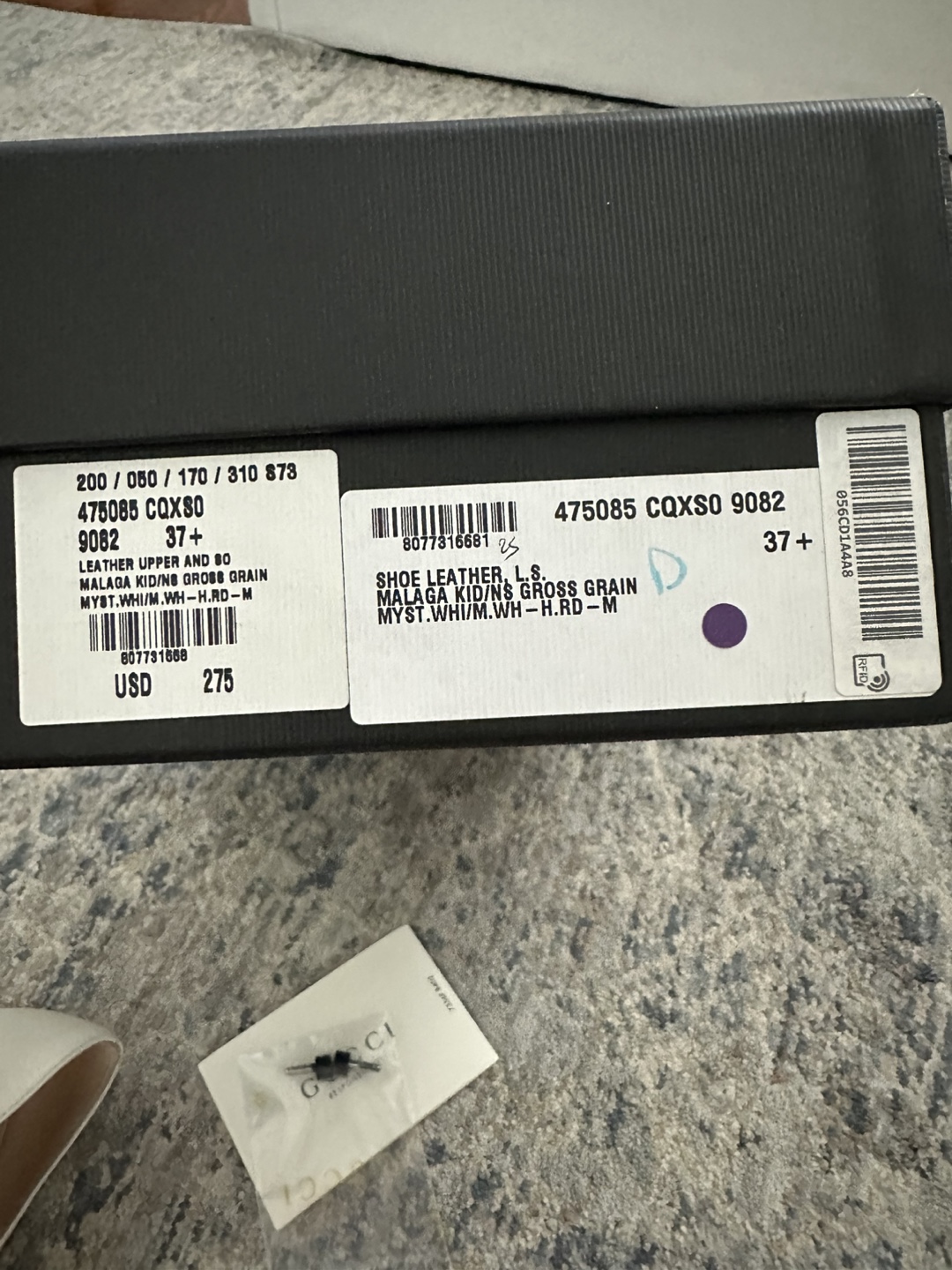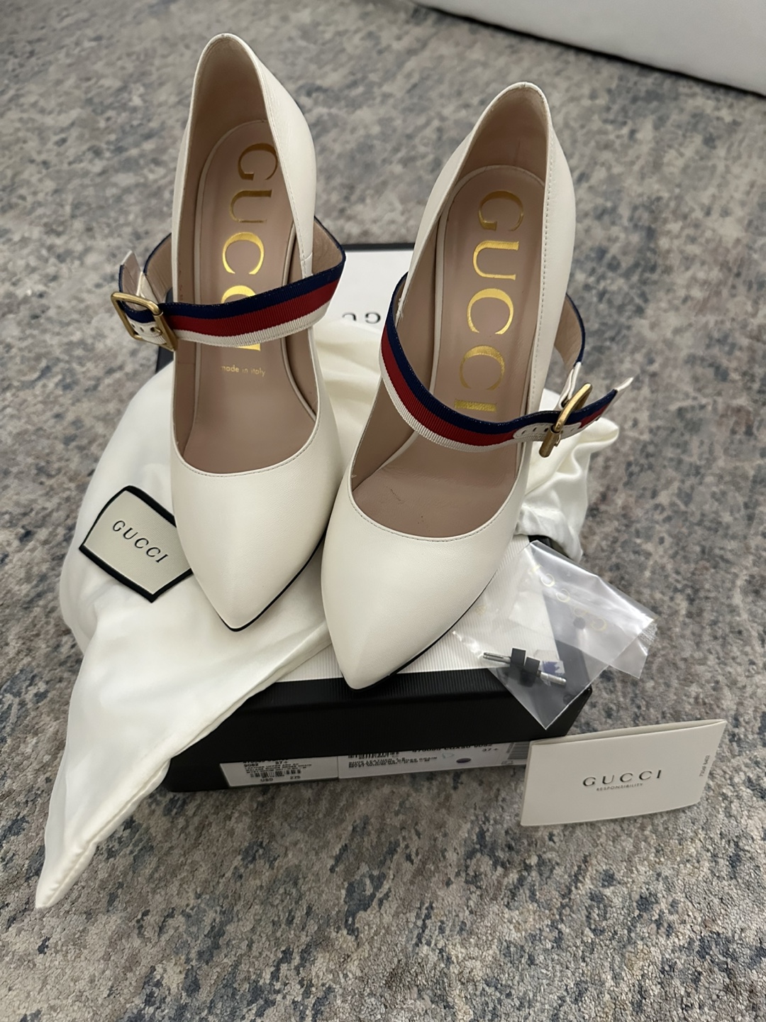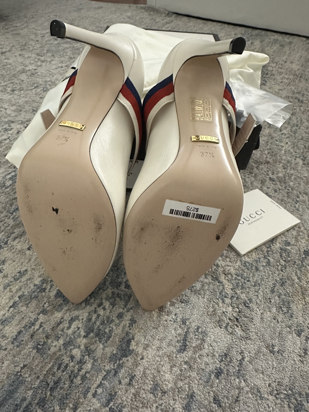 Selling a pair of Gucci leather heeled pumps in size 37.5. These stylish heels feature a unique strap design with the classic Gucci colors. The original box and dust bag are included, and they were originally bought for $275!