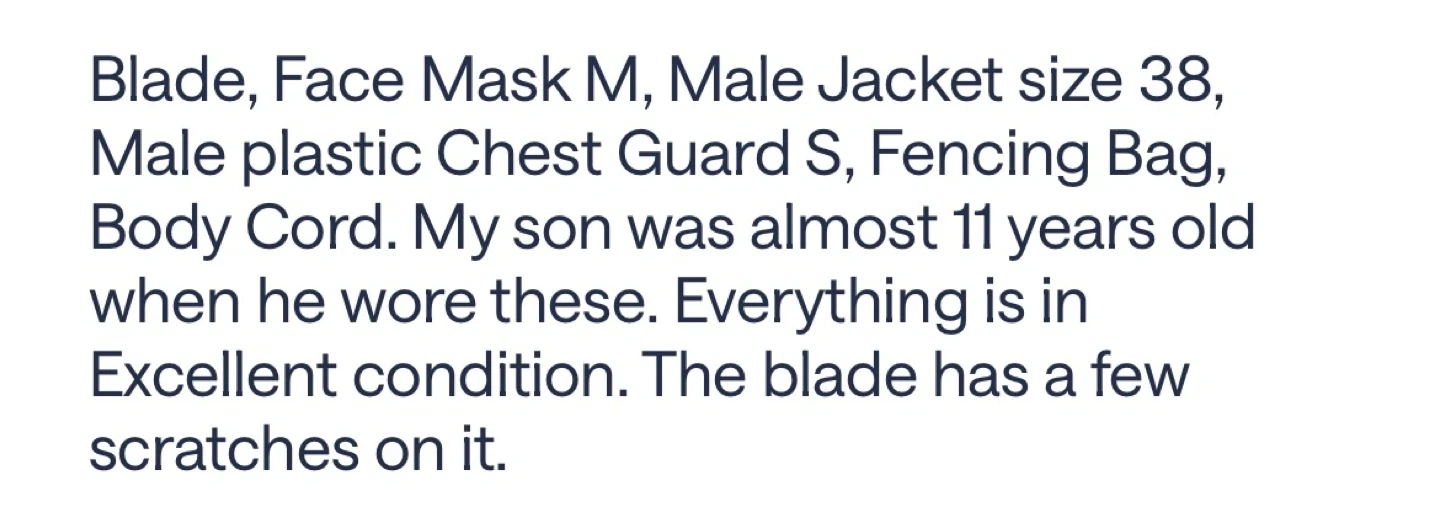Size 38. The sword has a few scratches.