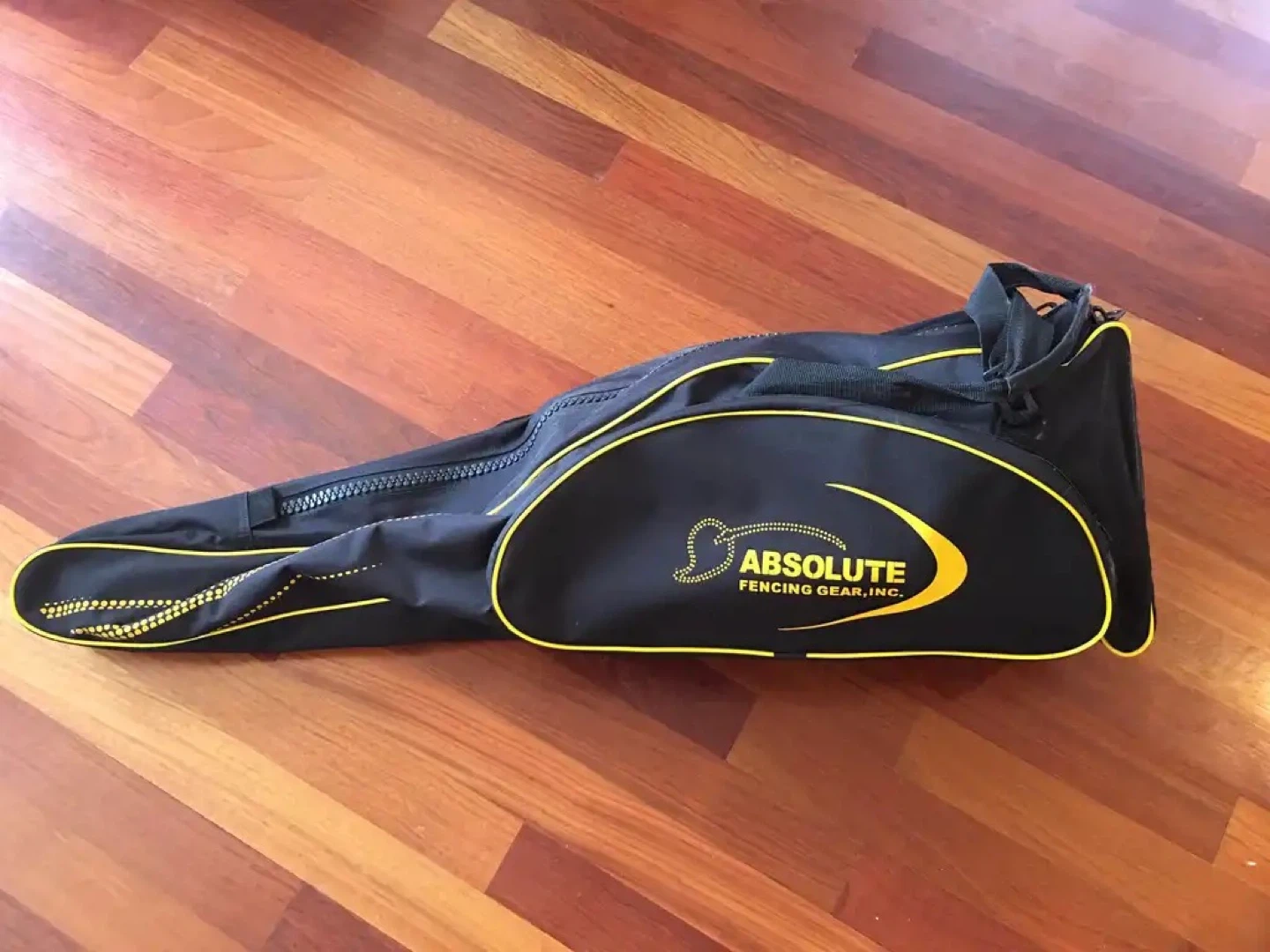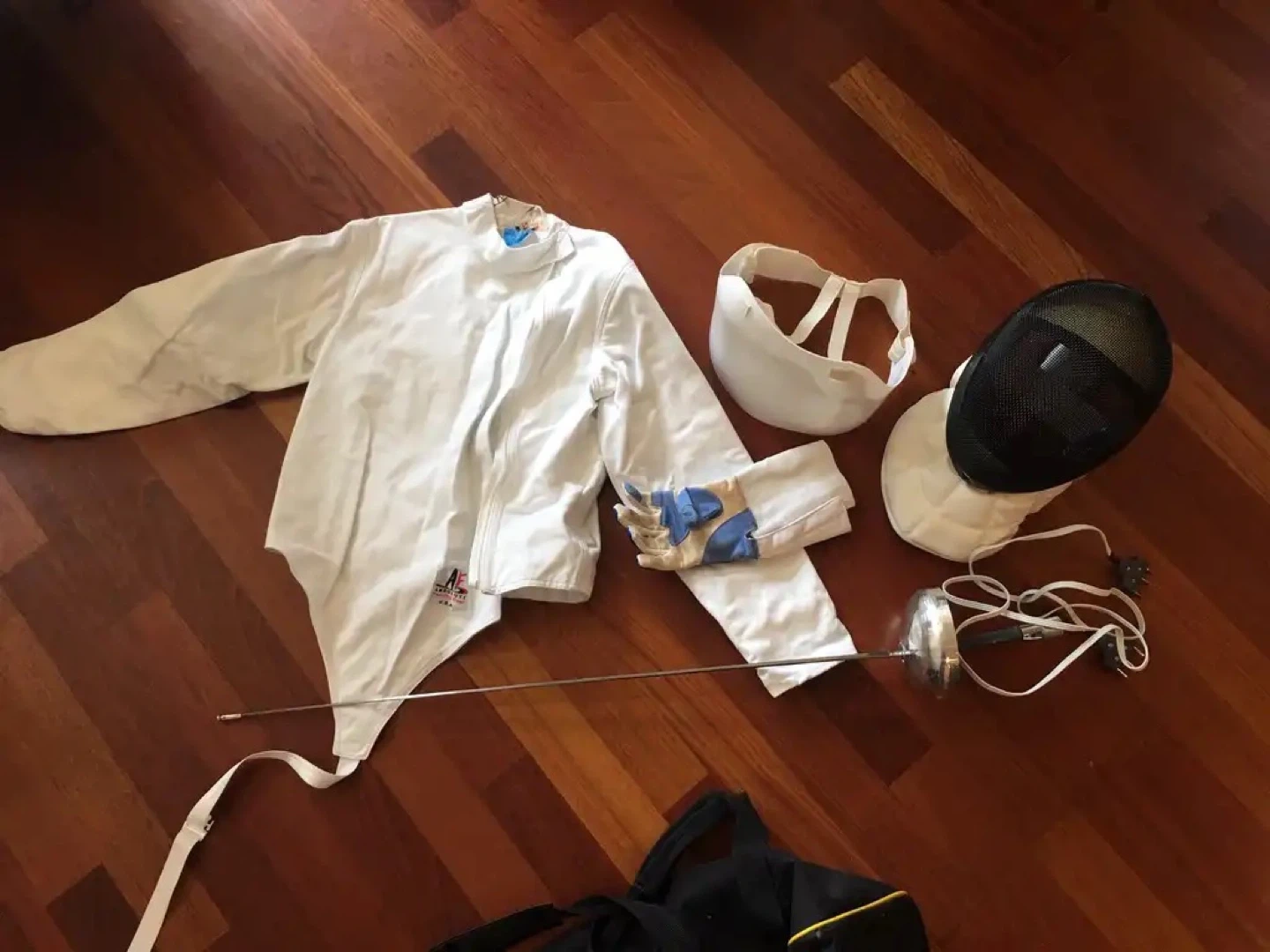 This is a complete fencing set from Absolute Fencing Gear. It includes a fencing jacket, a mask with a black mesh front, a glove with blue accents, and a fencing sword. A carrying bag is also included to store your gear.