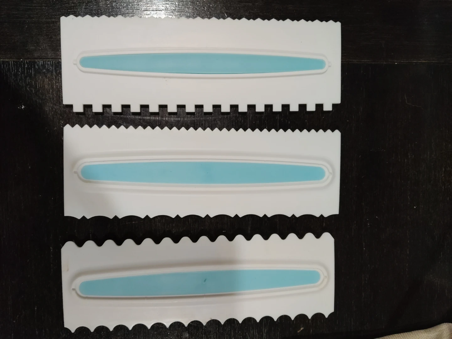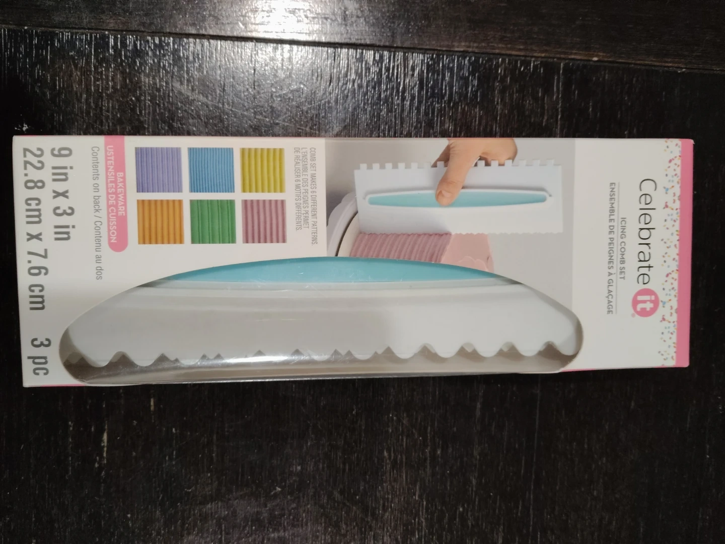 Selling a Celebrate It icing comb set! This set includes 3 pieces. The size is 9 in x 3 in (22.8 cm x 7.6 cm). Great for creating different textures and designs on your baked goods