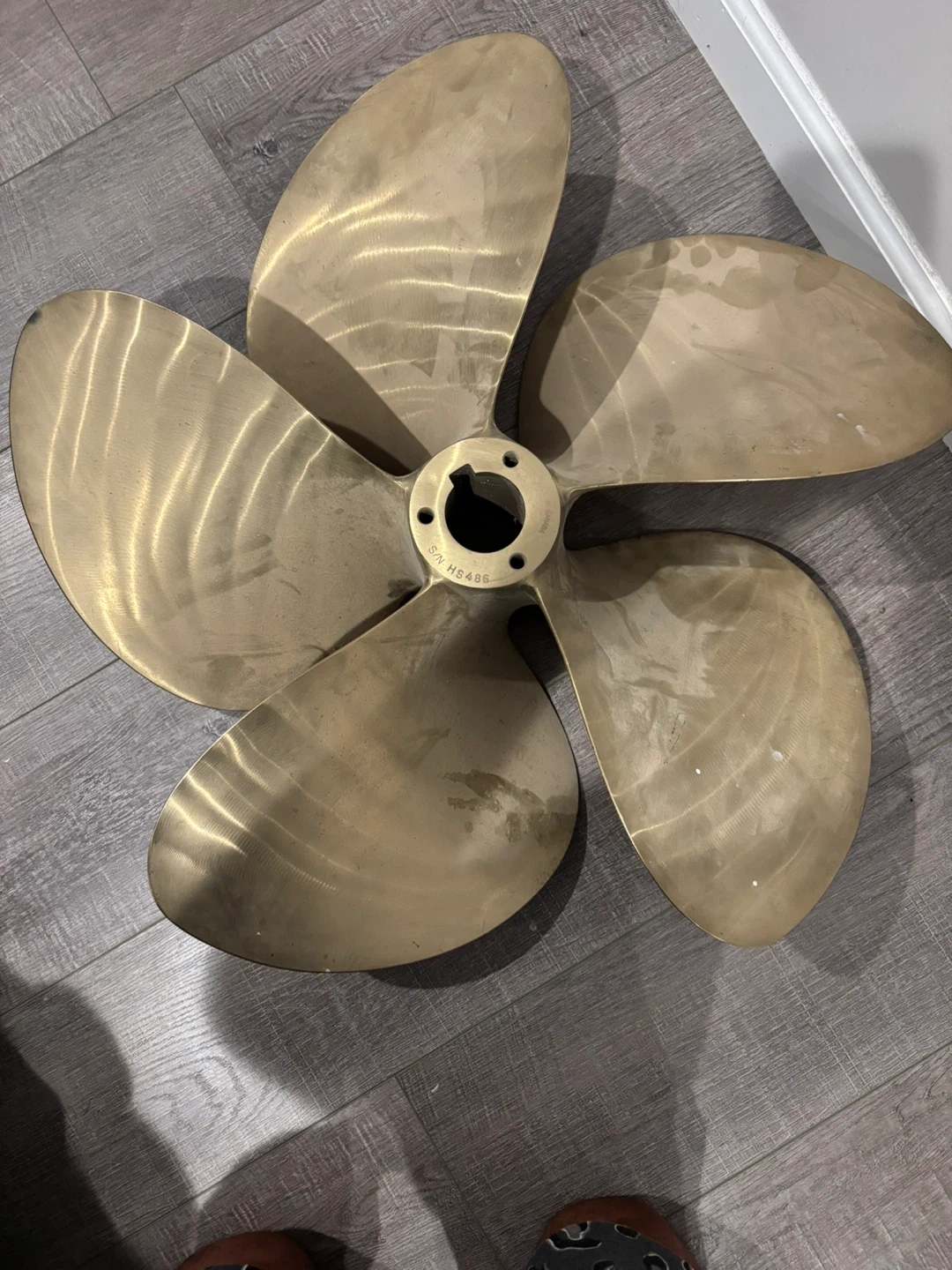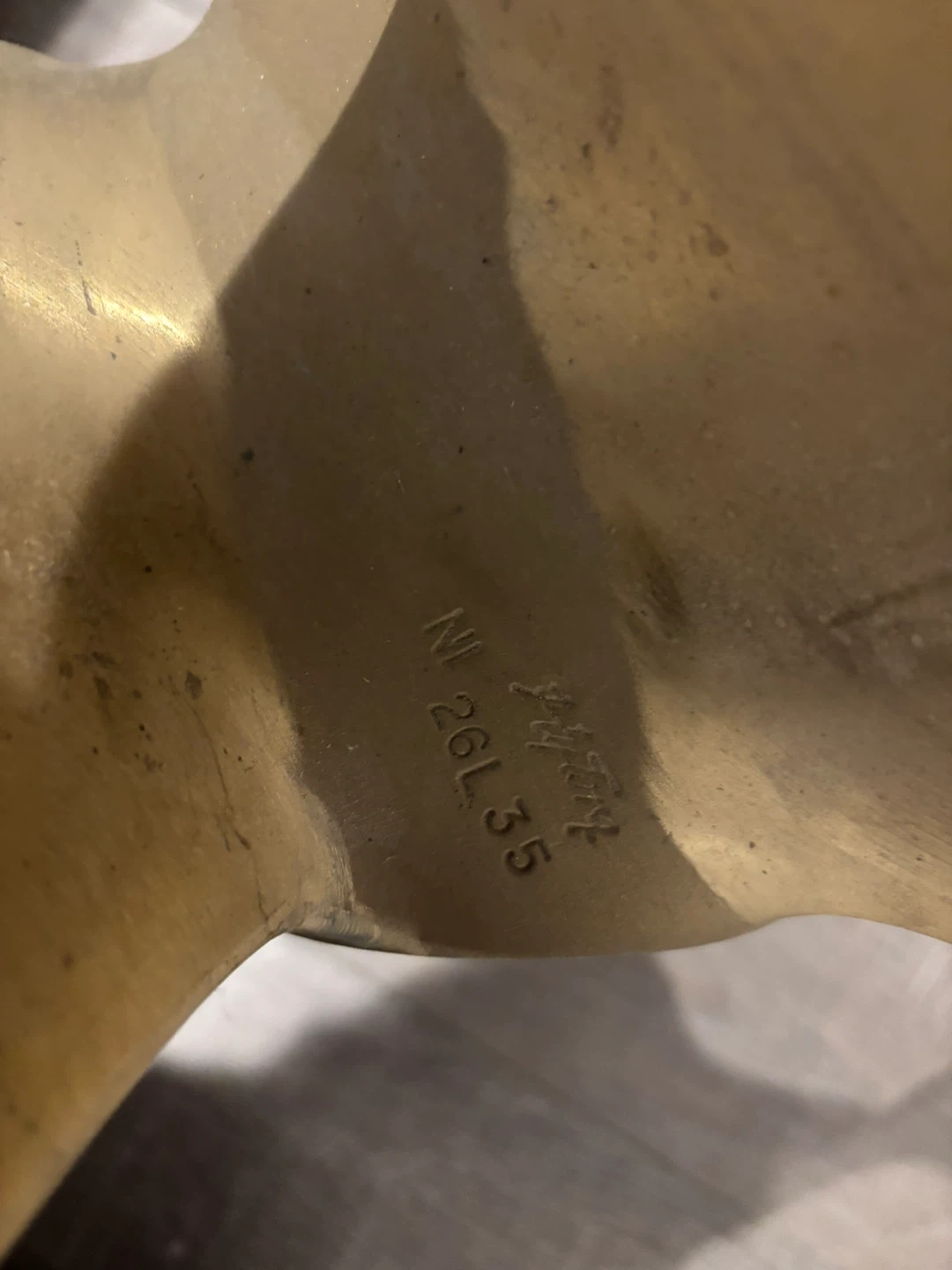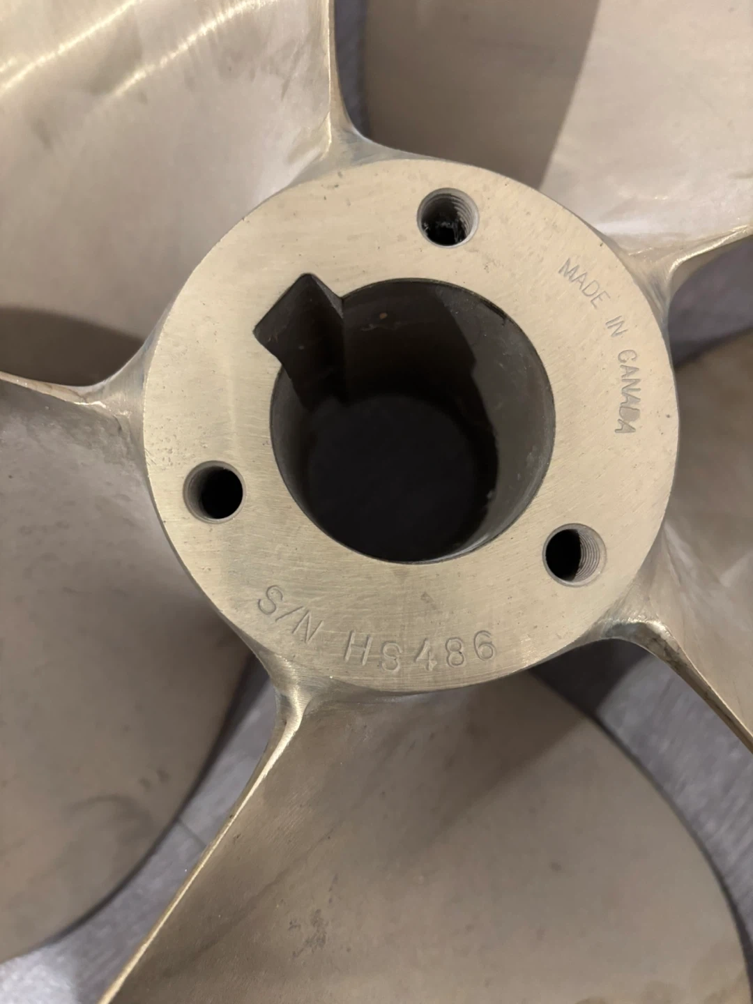 Selling a boat propeller in good condition. It has a 5-blade design and is made in Canada. The serial number is HS486. There's a marking that says NL 26L35.