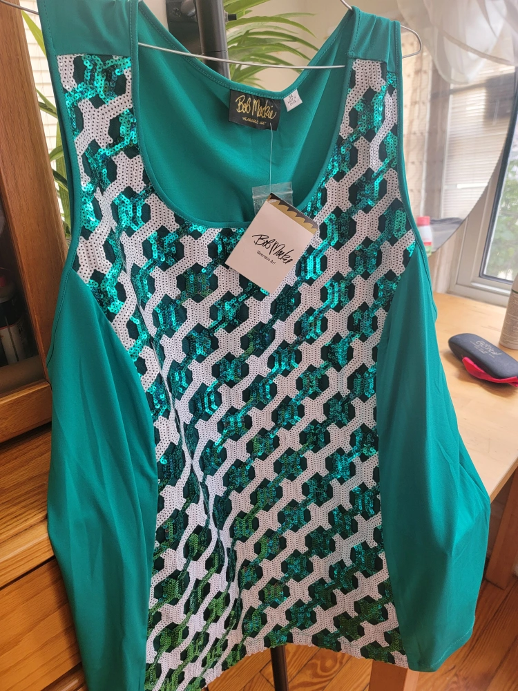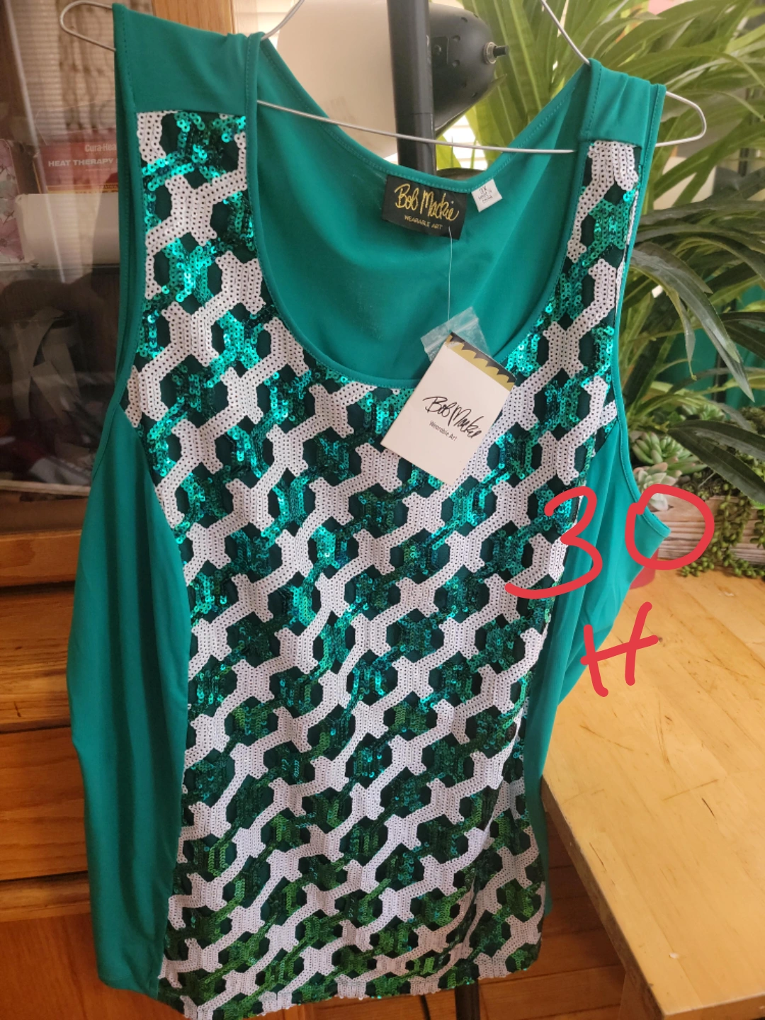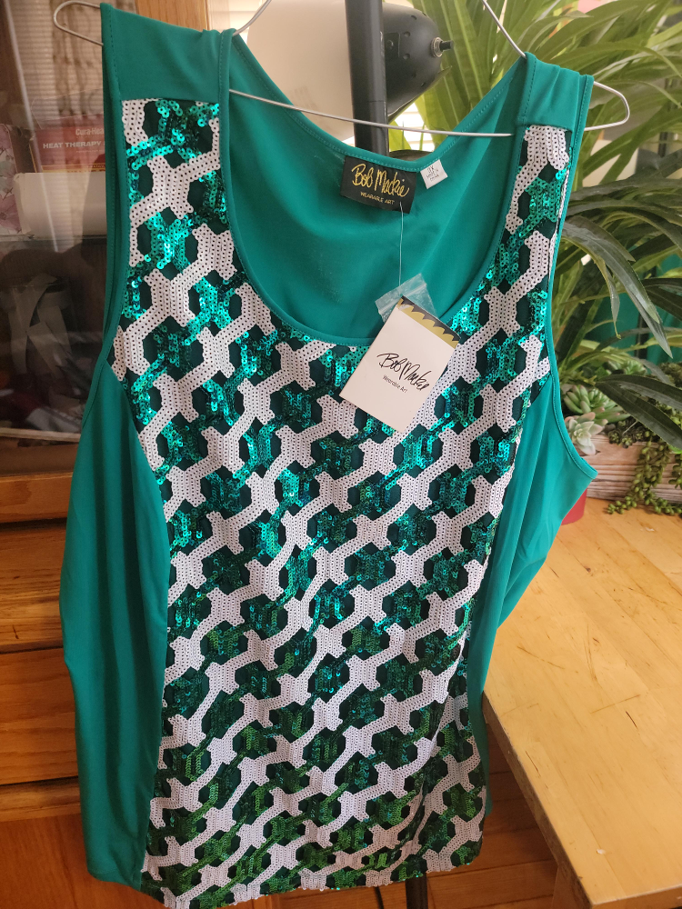 81Selling a beautiful Bob Mackie Wearable Art tank top in a vibrant green color! The tank features stunning sequin detailing, making it a unique and eye-catching piece. It's a size 1X and in excellent condition, ready to add some sparkle to your wardrobe