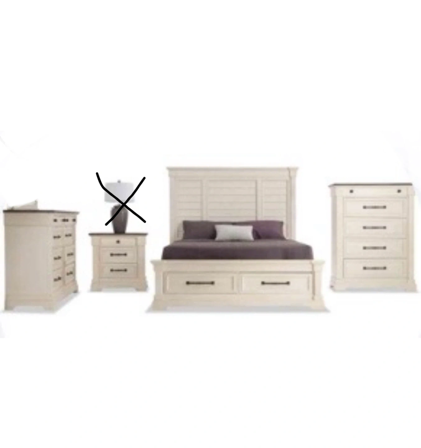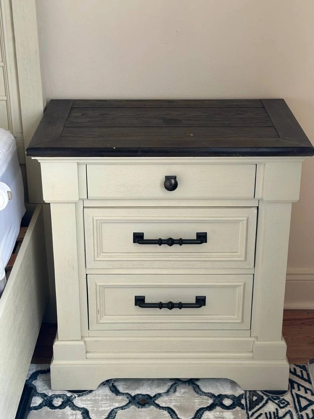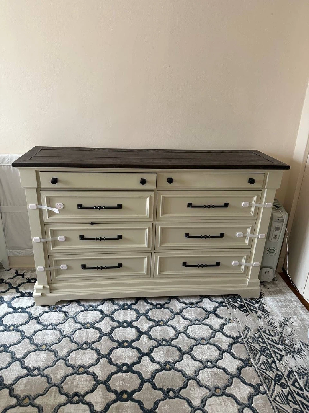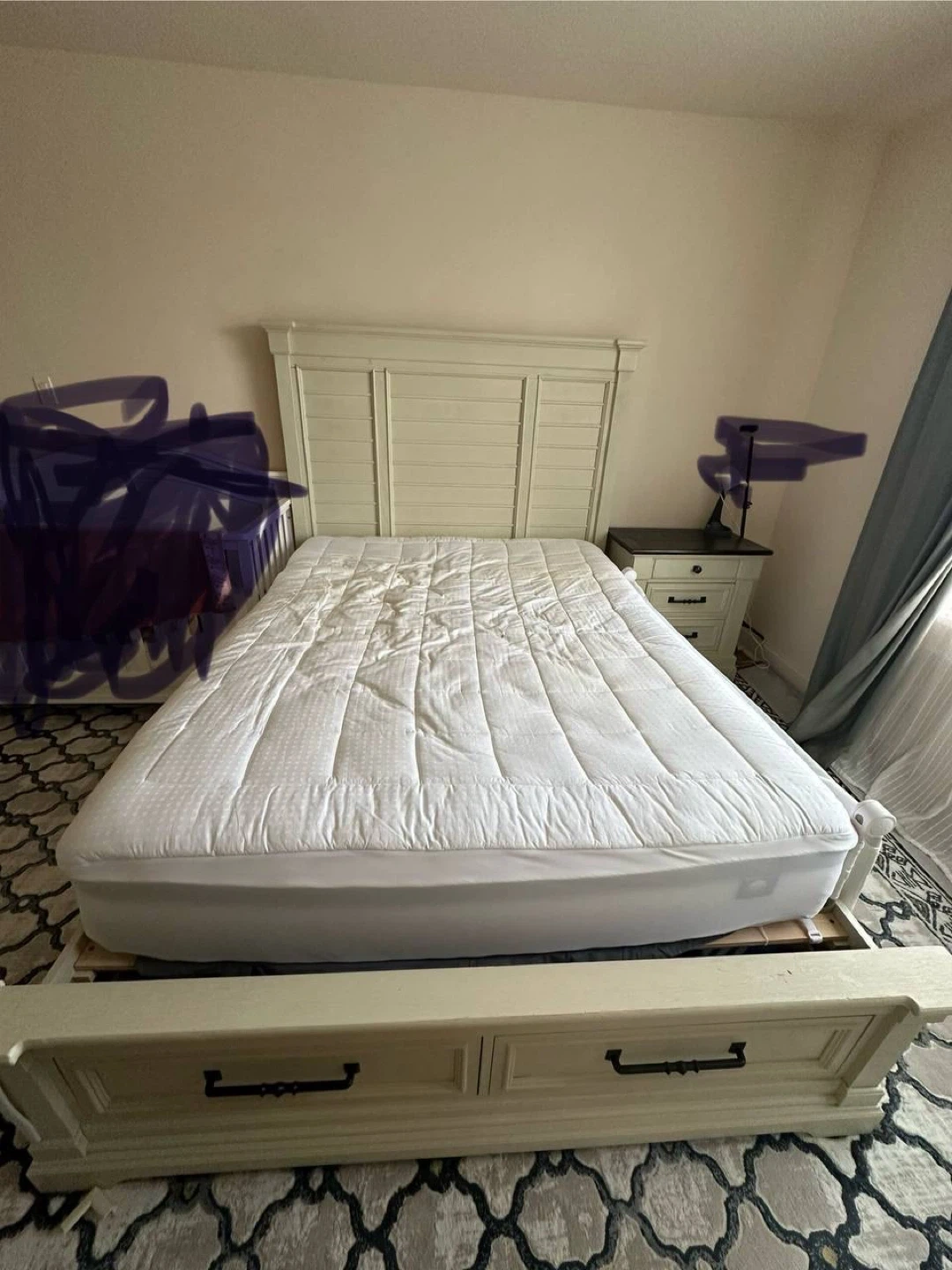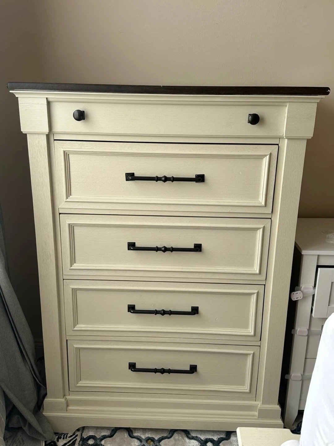 Selling a like new bedroom set including a dresser, chest, nightstand, and bed frame and mattress . The set is in good condition and features a two-tone design with a light-colored base and a dark top. Perfect for furnishing a bedroom with a cohesive look.
