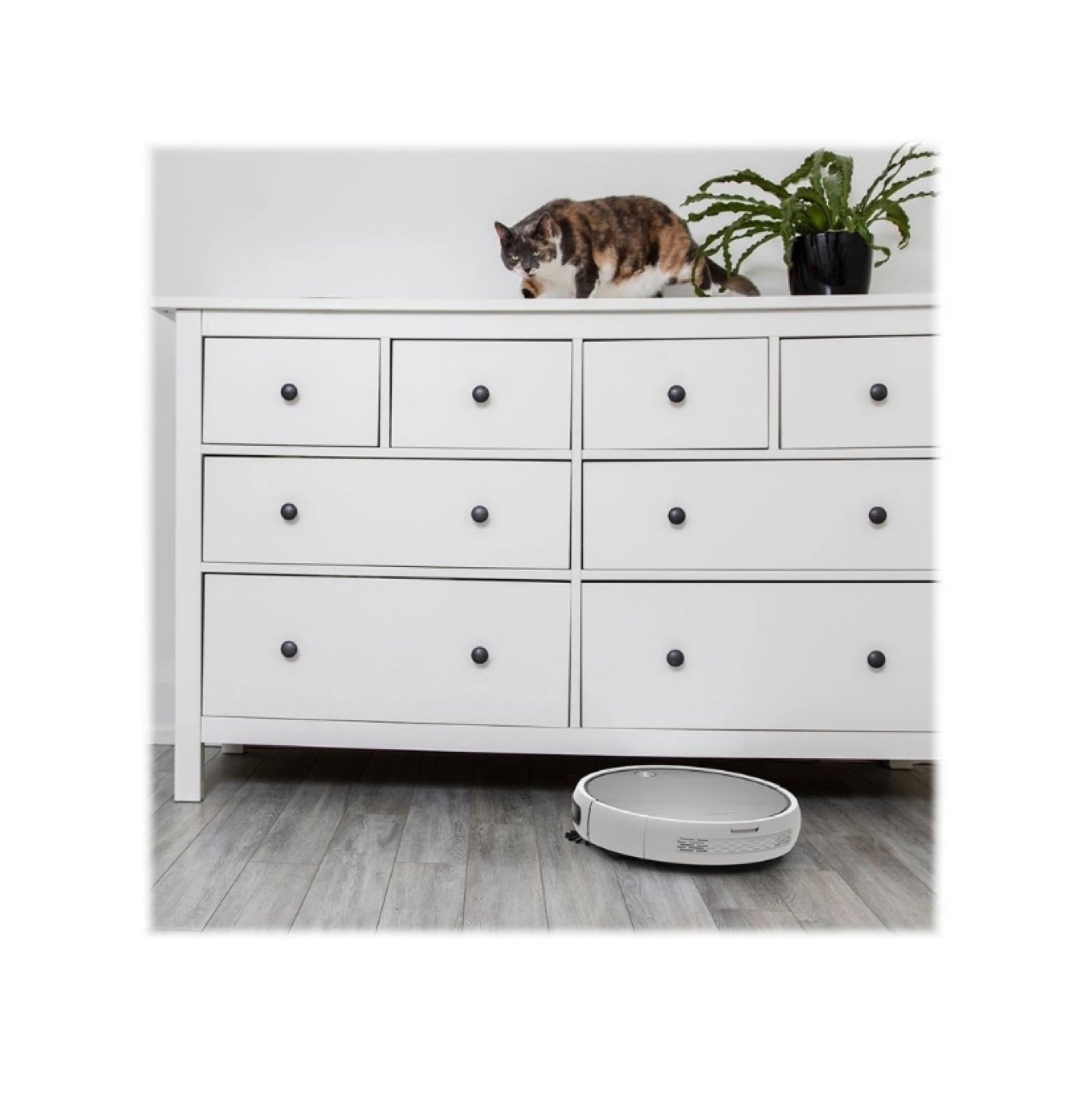 25Robot vaccum-silver color -cordless -bagless -weigh 4.9 lbs -self charging charger included -maximum runtime is 100 minutes -HxLxW is 3.2 x 12.8 x 12.8