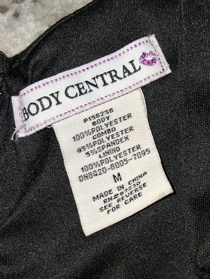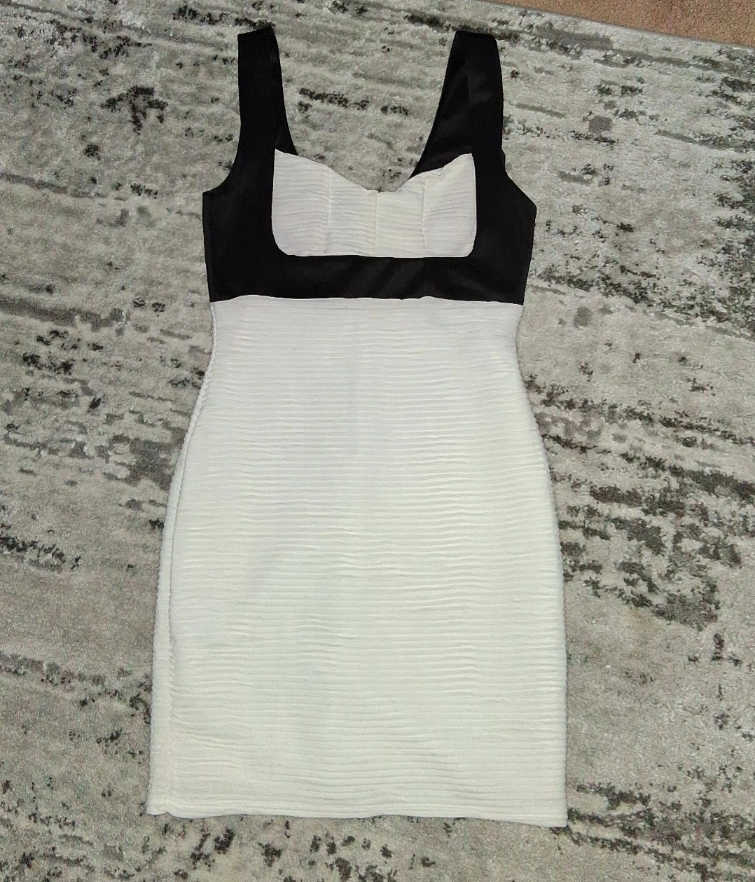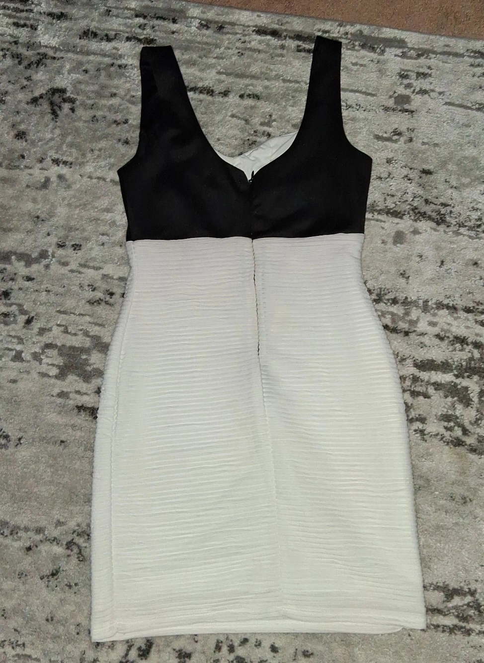 Selling a Body Central dress in size M. It's a cute black and white dress made of polyester and spandex.