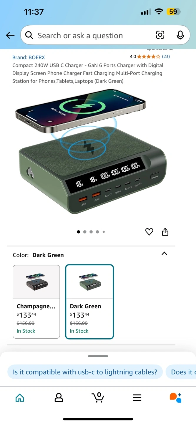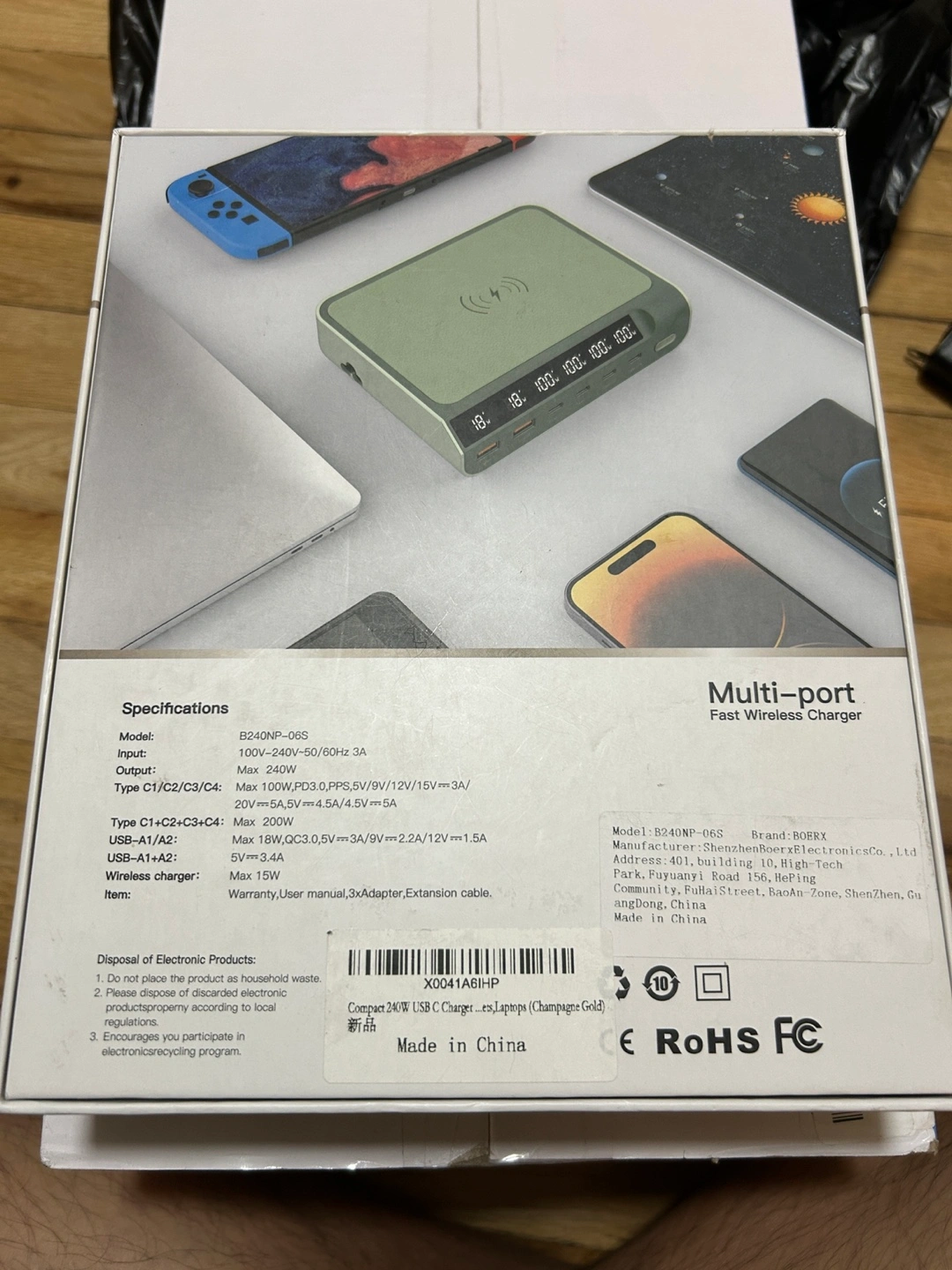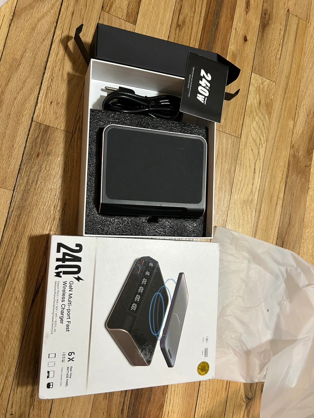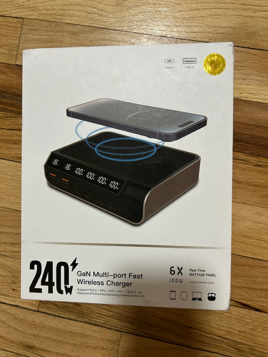 167Compact 240W USB C charger. Features fast charging with digital display station for phones, tablets, and laptops. Includes multiple USB ports and wireless charging capabilities.