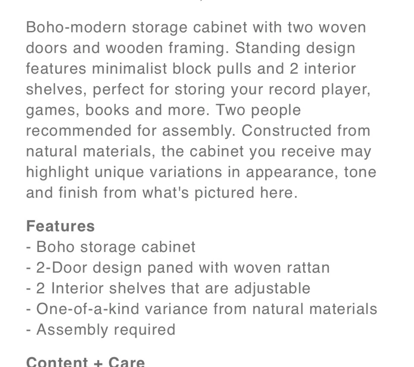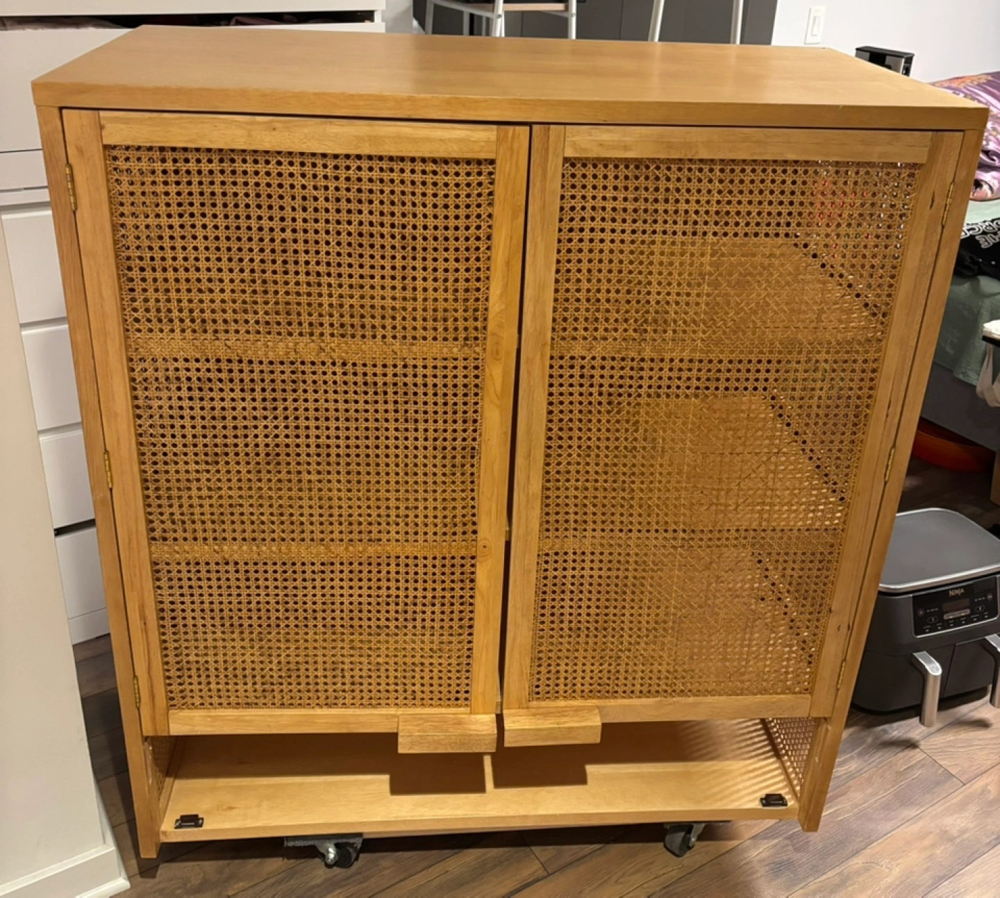 This is a boho-modern storage cabinet featuring two woven doors and wooden framing. It has a standing design and minimalist block pulls. There are two interior shelves, perfect for storing your record player, games, books, and more. The cabinet is constructed from natural materials, so there may be unique variations in appearance, tone, and finish from what's pictured here