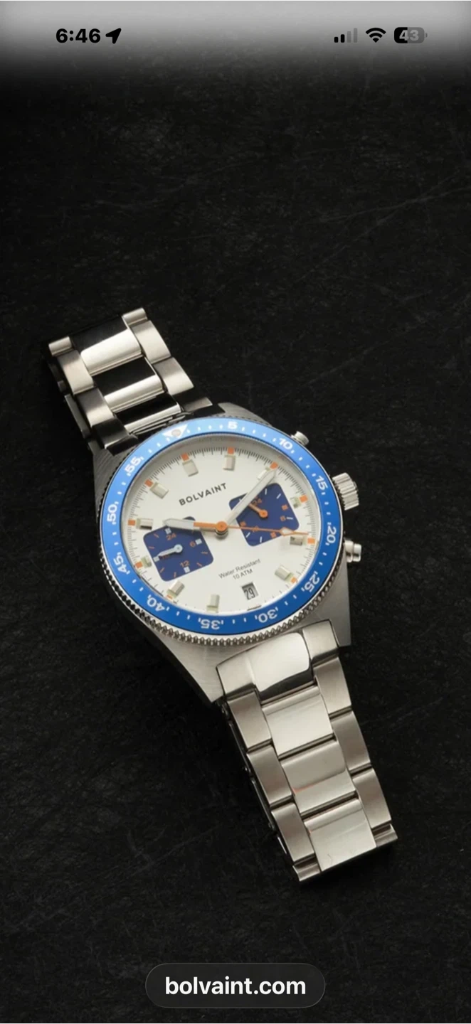 76Selling a Bolvaint Balmat Argent watch in a striking blue color! This contemporary take on a classic pilot's watch features a 40mm stainless steel case with two subdials and a unidirectional bezel. The stainless steel strap and casing are rust and corrosion-resistant, ensuring durability. Originally priced at $2,080.