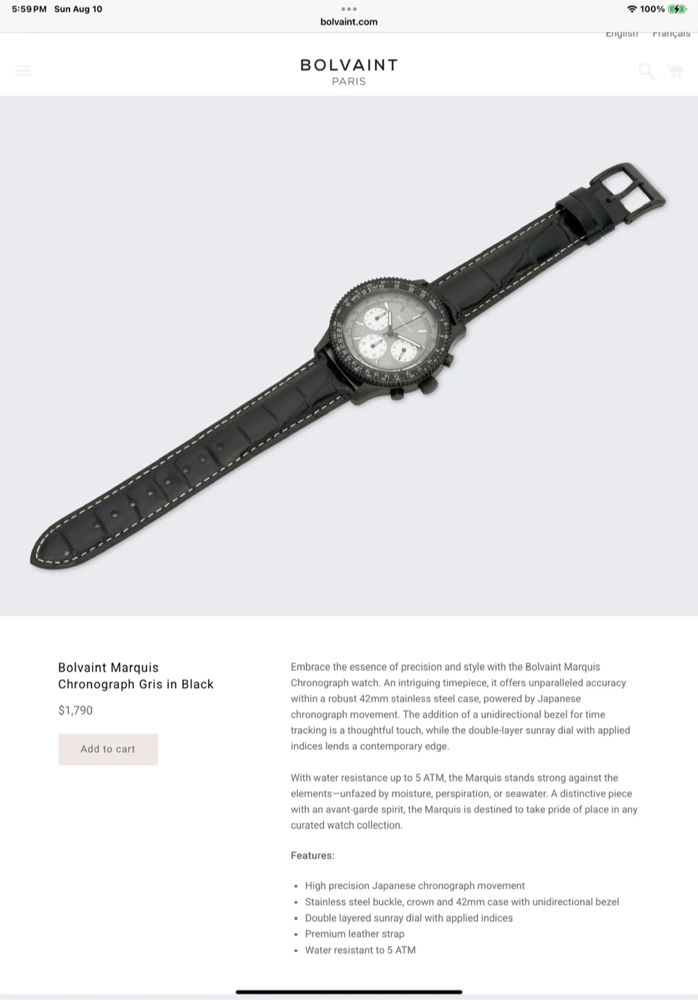 Selling a Bolvaint Marquis Chronograph Gris in Black. This watch features a robust 42mm stainless steel case and is powered by a Japanese chronograph movement. It also has a unidirectional bezel for time tracking and a double-layer sunray dial with applied indices. Features include: - High precision Japanese chronograph movement - Stainless steel buckle, crown and 42mm case with unidirectional bezel - Double layered sunray dial with applied indices - Premium leather strap - Water resistant to 5 ATM