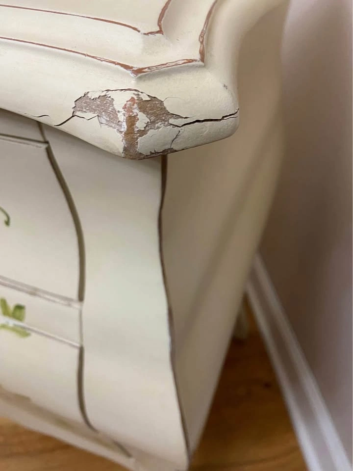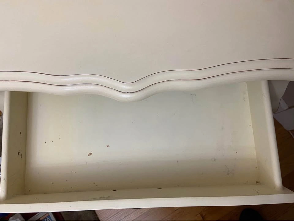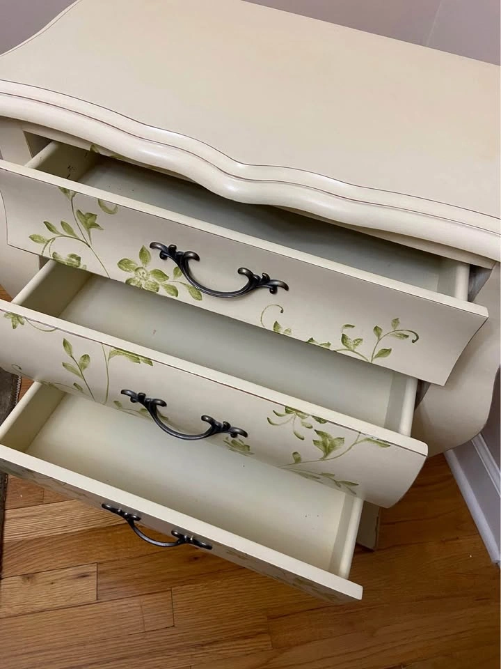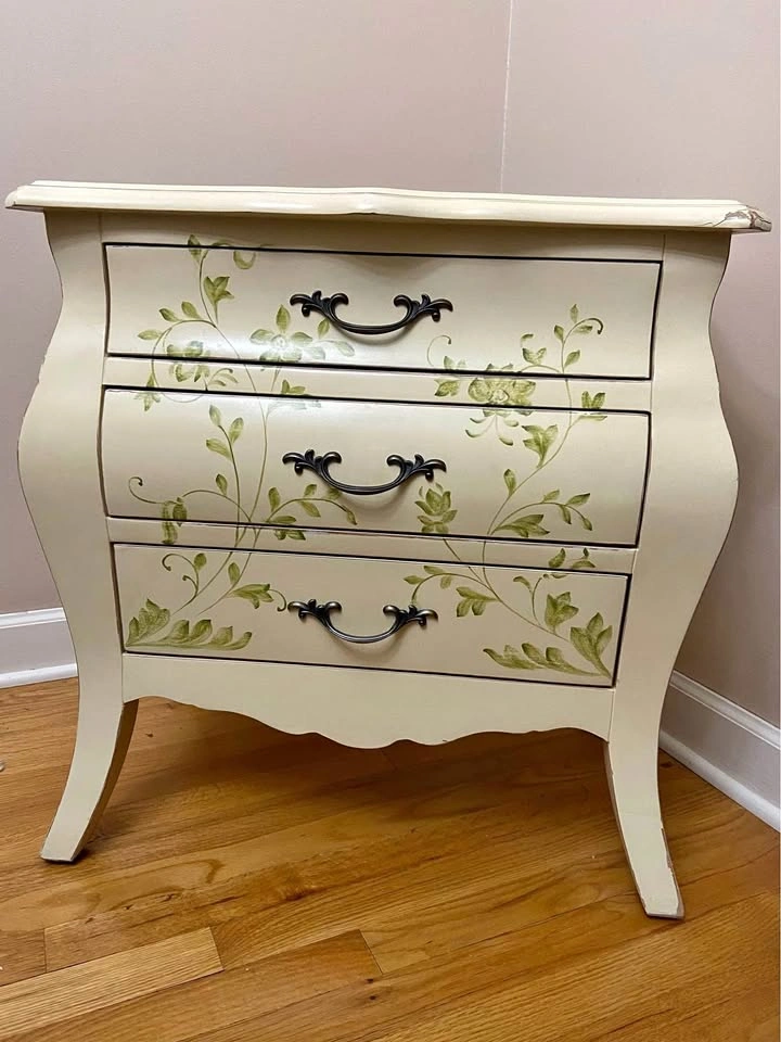 65Bombay-style wood chest/accent table. -Cream color. -Hand-painted, green leaf/flower motif. -3 drawers that open/close smoothly. 26.5” Tall, 26” Long, 15.5” Deep. Damage to 1 corner, as seen in photo. Top drawer is a bit marked up, in photo. Needs a good cleaning. Solid chest. Cash only. Meet in Garfield Ridge, Chicago, near Midway. Willing to meet near Burbank, Bridgeview, Oak Lawn, EP, Alsip ☺️